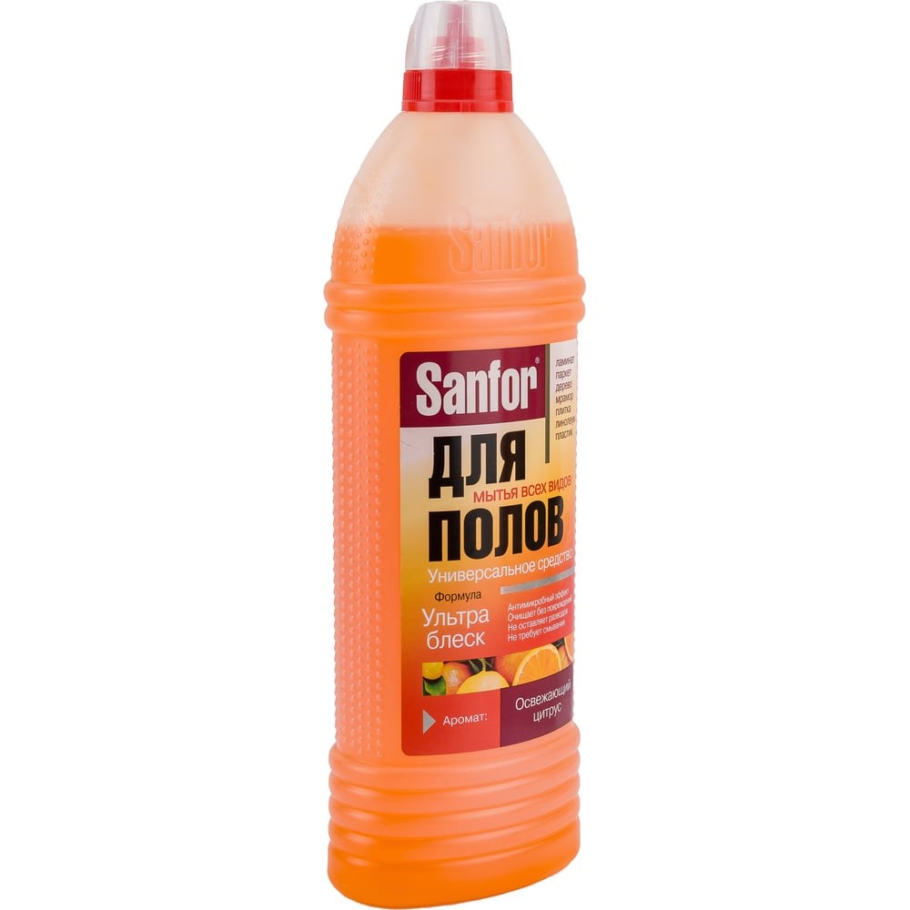 Универсальное средство для мытья полов SANFOR УЛЬТРА БЛЕСК Освежающий цитрус 1000 мл 9841 представляет собой универсальное средство для мытья пола с формулой "Ультраблеск". Подходит для ухода за любыми полами по всему дому: ламинат, линолеум, паркет, дерево, керамическая плитка, мрамор, пластик, окрашенные поверхности. Эффективно очищает, не оставляет разводов, не требует смывания водой. Средство обладает антимикробным и антистатическим действием. Не содержит хлор. Придает поверхности сияющий блеск чистоты.