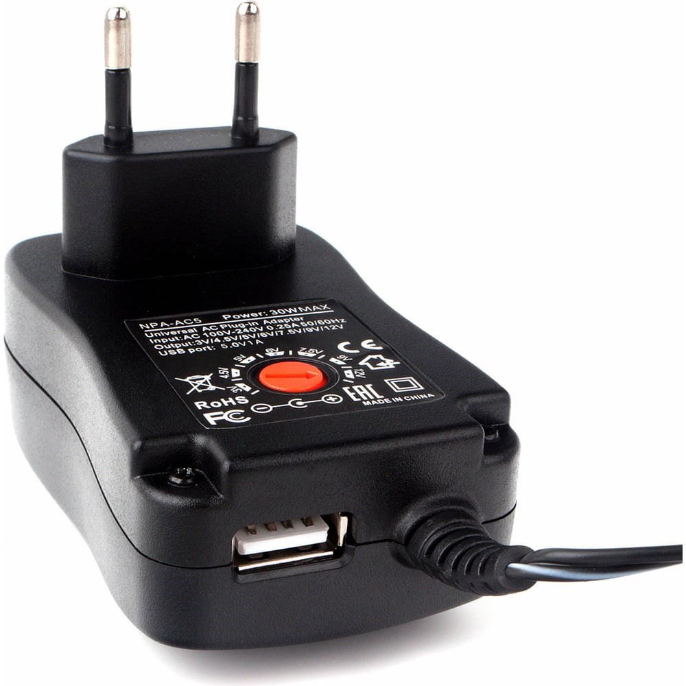 Универсальный адаптер питания Gembird 30Вт 8 штекеров NPA-AC5 для различных устройств (роутеры, лампы и т.д.). В комплекте ключ для удобного переключения напряжения. Полярность - внутренний плюс (+), наружный минус (-). Максимальная мощность - 30Вт, Режимы: 3В/4,5В/5В/6В/7,5В/9В/12В. Предельное значение силы тока: 2А Размеры штекеров: 6,3х4,0 мм, 6,0х3,0 мм, 5,5х2,5 мм, 5,5х2,1 мм, 5,5х1,7 мм, 4,8х1,7 мм, 4,0х1,7 мм, 3,5х1,35 мм. Сила тока и выходящее напряжение: 3В до 2А; 4,5В, до 2А; 5В до 2А; 6В до 2А; 7.5В до 2А; 9В до 2А; 12В до 2А. Дополнительные характеристики: Есть USB разъем: 5В до 1А Входящее напряжение: 110-240В Мощность 30Вт Max. Форма штекеров в комплекте: угловая. Материал изделия: ABS и OC и + огнестойкие материалы. Классы защиты: SCP (защита от короткого замыкания, OVP (защита от превышения выходного напряжения), OCP (защита от перегрузки по току), OTP (защита от перегрева). LED индикатор работы адаптера питания. Нестабилизированный, трансформаторный.
