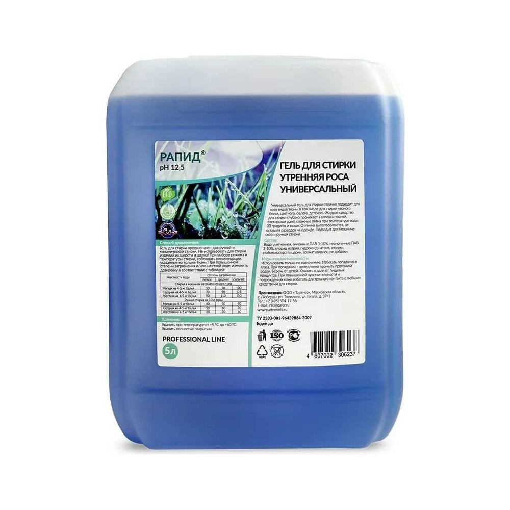 Универсальный гель для стирки Рапид Утренняя роса, 5 л отлично подходит для всех видов ткани, в том числе для стирки черного белья, цветного, белого, детского. Средство глубоко проникает в волокна тканей, отстирывая даже сложные пятна при температуре воды 30 градусов и выше.Отлично выполаскивается, не оставляя разводов на одежде.Подходит для механической и ручной стирки.