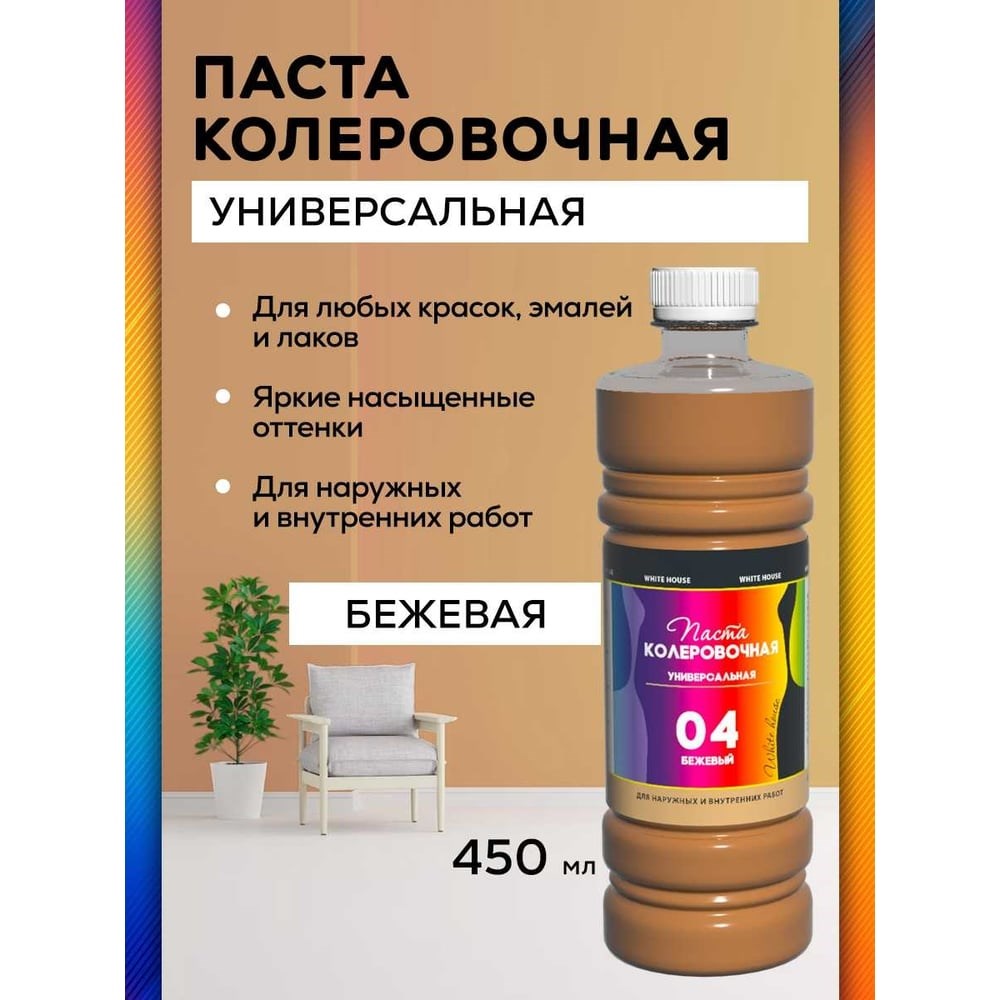 Универсальный колер White House (бежевый; 450 мл) 15642Колеровочная паста WHITE HOUSE - универсальный колер для краски для наружных и внутренних работ. Колеровочная паста подходит для тонирования масел и олифы, пропиток и аквалазурей, пигмента для гипса, известковых и цементных растворов, сухих строительных смесей, побелки, затирок и других материалов. Колер WHITE HOUSE универсален - его можно добавлять в любые строительные растворы: воднодисперсионные и латексные, титановые и алкидные, акриловые и силиконовые, масляные, ПФ и НЦ. Колеровочная паста светостойкая - пигменты не выгорают и не выцветают длительное время. Окрашенная поверхность получается однородной, тон глубокий. Колер для краски выпускается в практичной фасовке 100мл и 450мл. Цвета можно смешивать между собой для создания новых оттенков колера для акриловой краски или колера для эпоксидной смолы. Оттенок колера краски для стен в готовом растворе может незначительно меняться в зависимости от типа используемого строительного материала (эмаль масляная краска, водно-дисперсионная краска лак и т.д.). Для получения ярких насыщенных цветов добавляйте колер для акриловой краски в прозрачную краску "база С", она идеальна для колеровки. Если добавите коллер в белую краску, то Вы получите потрясающие пастельные оттенки.