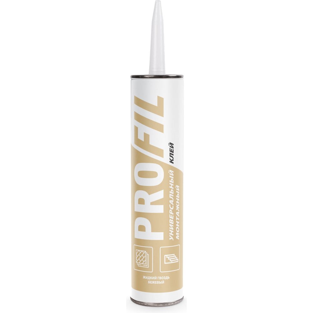Клей монтажный универсальный Profil «Жидкий гвоздь»на основе синтетического каучука, быстроотверждающийся, содержит неагрессивные растворители. Отличается превосходной адгезией ко всем строительным поверхностям, за исключением тефлона, ПЭ и ПП. Можно применять к полистиролу и деликатным отделочным материалам. Заполняет и выравнивает неровности поверхности. После отверждения водостоек.Область применения: : крепление плинтусов, профилей, декоративных плит из полиуретана, пробки, пластмассы и ДСП к кирпичу, бетону, штукатурке и металлам; аварийное крепление керамических плиток, рукояток; приклеивание защиты для кабеля, стеновых панелей и прочих облегченных конструкцийИнструкция по применению: обрабатываемая поверхность должна быть чистой, сухой и обезжиренной. Клей наносить полосками или точками на одну из склеиваемых поверхностей с интервалом 10-20 см. Соединить детали и сильно сжать. Клей полностью приобретает свои свойства через 48 часов. Не применять к предметам, постоянно погруженным в воду. При склеивании тяжелых деталей или при вертикальных соединениях понадобится их механическая фиксация на время отверждения клея. Инструменты и свежие загрязнения очищать водой, а затвердевшие – механическим способом. Перед применением необходимо ознакомиться с техническим листом. Температура применения: от +5°С до +30°С (рекомендуется выше 15°С). Термостойкость после отверждения: от -60°С до +70°С. Открытое время – макс. 15 минут.