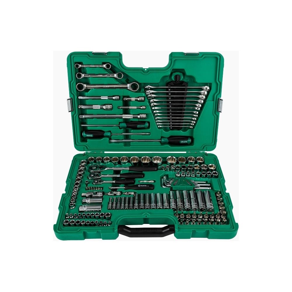 Универсальный набор инструмента, 150 шт, 1/4, 3/8 и 1/2 DR, Sata 09510 поставляется в удобном, закрывающемся кейсе для надежного хранения и транспортировки без риска утери компонентов. Каждый инструмент занимает свое отдельное место и легко извлекается из ячейки. Все предметы из представленного набора изготовлены из высокопрочной стали и имеют высокий рабочий ресурс. Данный комплект станет прекрасным помощником для выполнения широко спектра ремонтных и монтажных работ с использованием крепежных элементов различных типов и размеров. Внимание! Внешний вид товара может отличаться от представленного на фото. На данный товар действует условие безусловного возврата