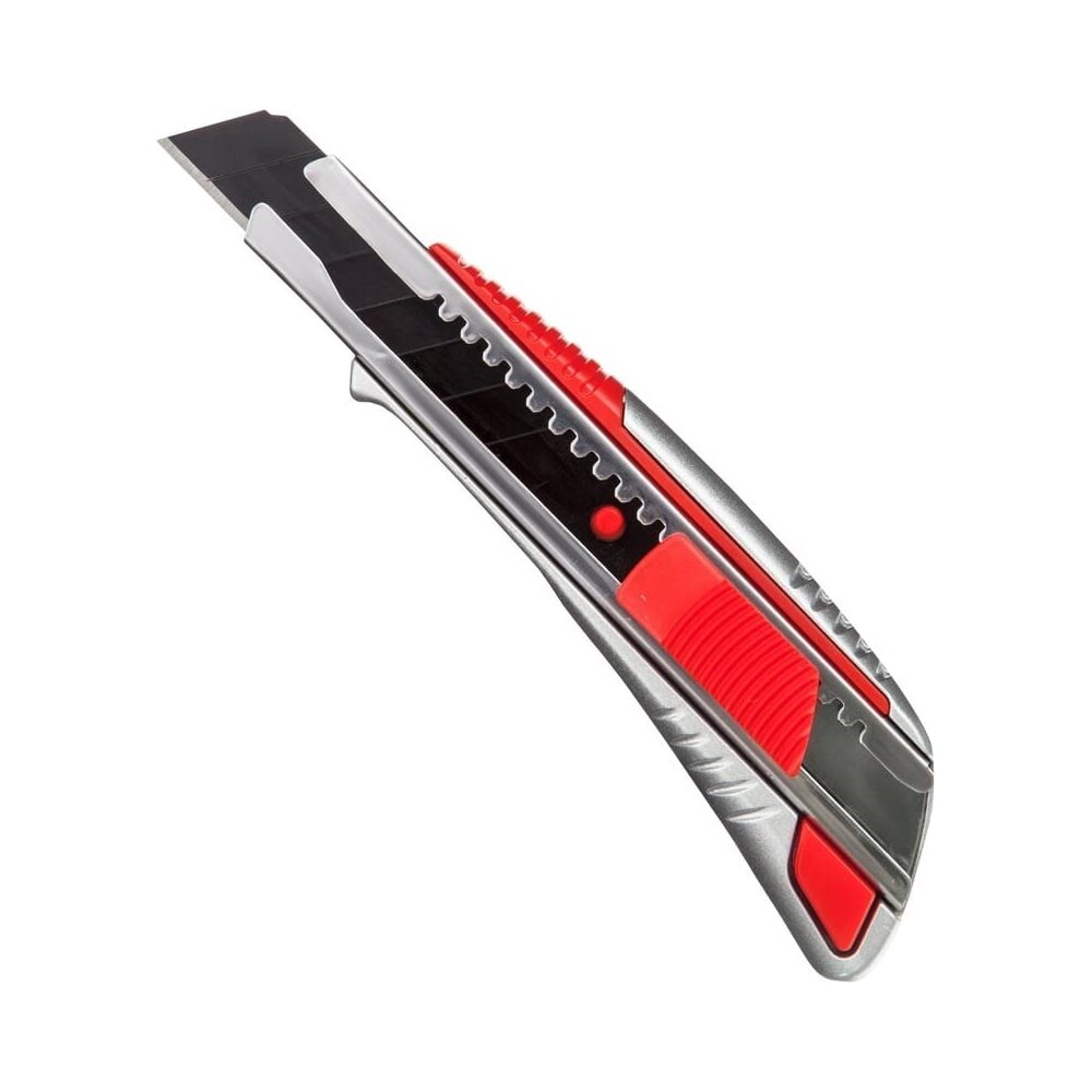 Универсальный нож с сегментированным отламывающимся лезвием используется для резки широкого спектра материалов: ткани, бумаги, кожи, пленки и т. п. Эргономичный, надежный корпус с пластиковыми вставками с рифлением обеспечивает комфортную эксплуатацию. Металлическая направляющая из нержавеющей стали гарантирует надежную фиксацию лезвия в момент использования. Особенности изделия: Корпус выполнен из алюминия — устойчив к коррозии Сменное сегментированное лезвие из вороненой инструментальной углеродистой стали Лезвие изготовлено с технологией лазерной заточки, позволяющей создавать ровную и прочную режущую кромку Система автоматической фиксации лезвия (Auto-lock) позволяет отрегулировать длину лезвия и закрепить его положение