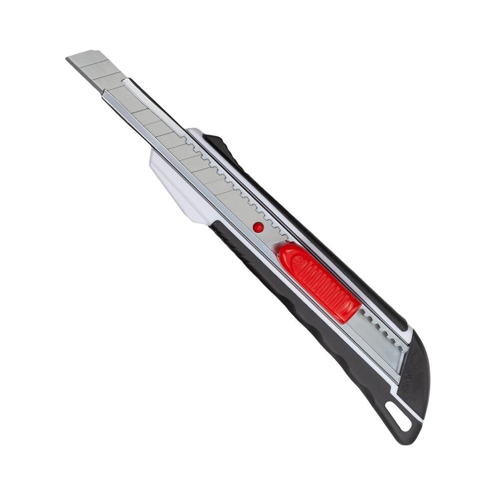 Универсальный нож с сегментированным отламывающимся лезвием используется для резки широкого спектра материалов: ткани, бумаги, кожи, пленки и т. п. Эргономичный, надежный корпус с вставками из термопластичного каучука (TPR вставка) препятствующих скольжению пальцев. Металлическая направляющая из нержавеющей стали обеспечивает надежную фиксацию лезвия в момент использования. Особенности изделия: Корпус выполнен из ударопрочного ABS-пластика Сменное сегментированное лезвие из высокоуглеродистой стали Лезвие изготовлено с технологией лазерной заточки, позволяющей создавать ровную и прочную режущую кромку Автоматический фиксатор лезвий (Auto-lock) позволяет отрегулировать длину лезвия и закрепить его положение Отверстие для крепления ножа
