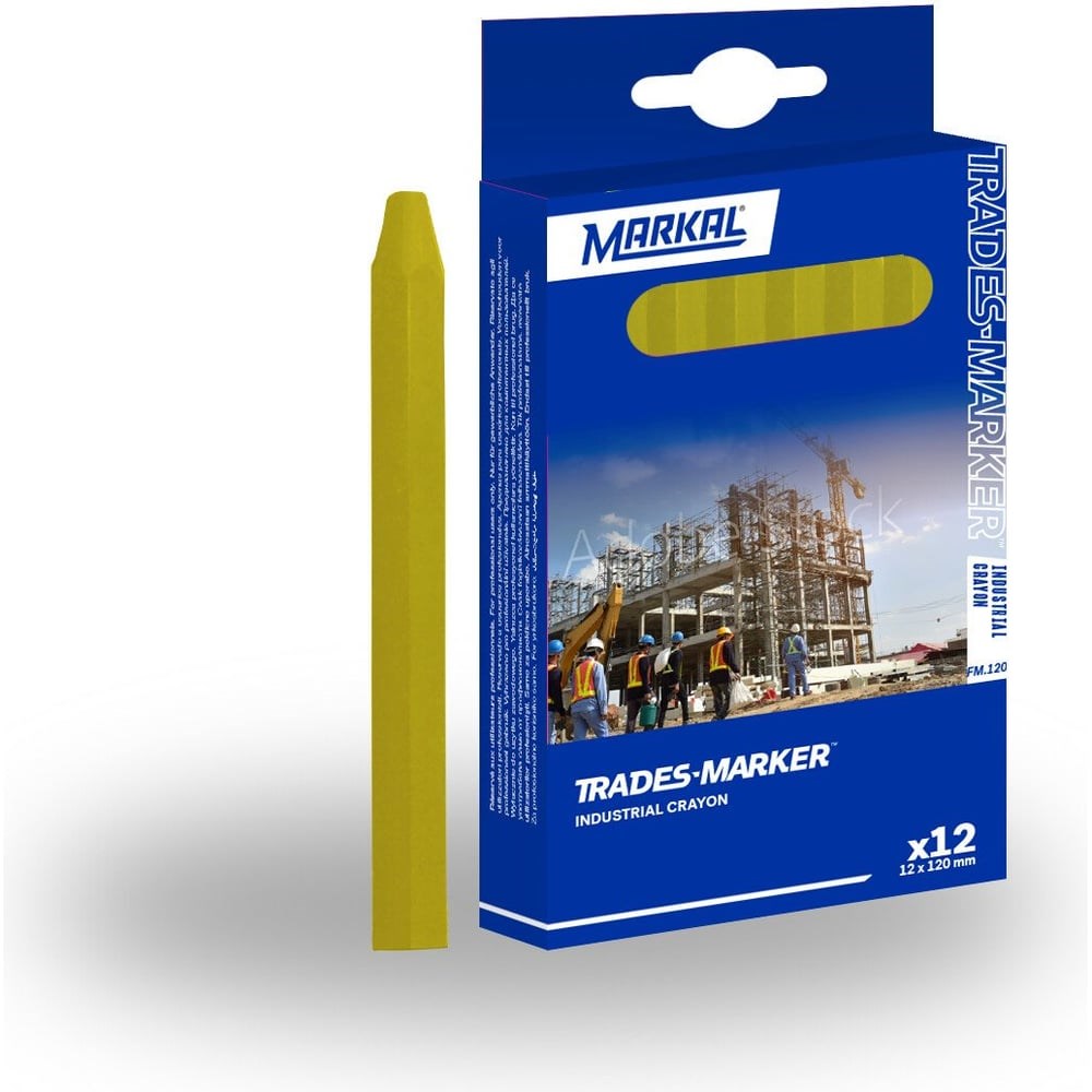 Восковой промышленный мелок Markal FM.120 универсальный, жёлтый 44010200можно использовать в любых погодных условиях.Мелок предназначен для маркировки практически любых материалов и поверхностей. Имеет высокую твердость и удобен для шероховатых поверхностей. Мелок хорошо пишет по металлу, дереву, пластику, картону, бетону, резине и другим материалам. Мелок Markal FM.120 предназначен для промышленного и индустриального использования и выпускается в виде твёрдого бруска краски с добавками воска и цветовых пигментов.Мелок хорошо пишет по различным поверхностям, например по ржавому металлу, сырому дереву, и грубому бетону. Может использоваться как внутри помещения, так и на открытом воздухе. Маркировка водостойкая, остаётся яркой и легко читаемой в течение долгого времени. Не боится различных погодных условий и сурового климата, не выгорает на солнце. Рабочий температурный диапазон от -20°C to +50°C. Промышленные клеймовочные мелки Markal FM 120 выпускаются 6 ярких цветов: белый, чёрный, красный, синий, жёлтый и зелёный. Мелки можно купить в упаковках по 12 штук одного цвета.
