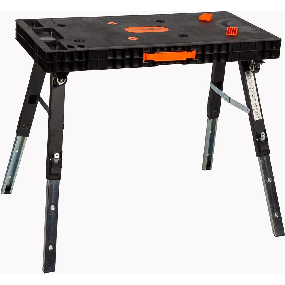 Максимальная нагрузка 150кг 4 в 1: верстак, козлы для пиления, строительные леса, автомобильная тележка Большая рабочая поверхность Регулируемая высота рабочего стола Транспортир Линейка с двух сторон Наличие розеток Лоток для мелочей Складная конструкция Поворотные колеса со стопором