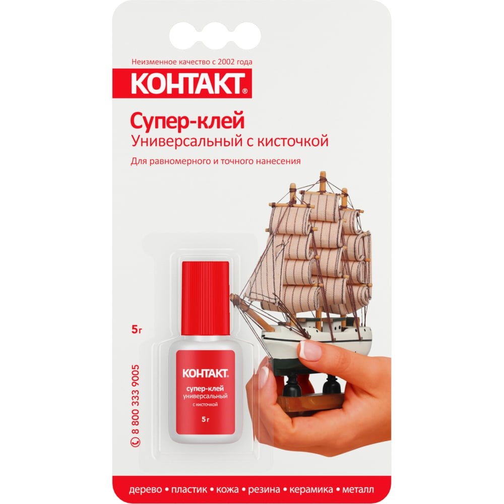 Супер-клей “КОНТАКТ” универсальный c кисточкой обеспечивает точное и равномерное нанесение, сокращая расход средства. Подходит для бытового ремонта: эффективно соединяет пластик, резину, металл, керамику и другие распространенные поверхности.СКЛЕИВАЕТ В ЛЮБОМ СОЧЕТАНИИ • дерево • пробка • пластик • кожа • резина • фарфор • керамика • металл100% РЕЗУЛЬТАТ Между склеиваемыми поверхностями не должно быть зазора. Чем больше площадь склеиваемых поверхностей, тем выше прочность склеивания. Однокомпонентный моментальный клей на основе этилцианакрилата обеспечивает сверхпрочное соединение материалов за 5-20 секунд с полной фиксацией через 10-15 минут.Супер клей секундный не предназначен для работы с полиэтиленом, полипропиленом, тефлоном. Не рекомендуется использовать для склеивания поверхностей, контактирующих с пищей.