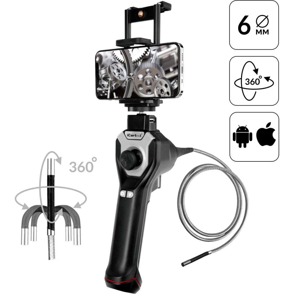 iCartool IC-V106AW - промышленный управляемый видеоэндоскоп с механизмом всесторонней артикуляции на 360 градусов для панорамного обзора исследуемой области. Управление камерой происходит с помощью чувствительного джойстика, расположенного на рукоятке прибора. Предусмотрена фиксация (блокировка) головки зонда в заданном положении.Видеоэндоскоп позволяет передавать изображения на смартфон посредством USB соединения, а также сохранять фото и видео в приложении в разрешении HD. В комплект входят кабели для подключения к различным устройствам с ОС Android / iOS.Камера с разрешением 1 Мп имеет автоматическую фокусировку в диапазоне от 1 см. Для работы в темных местах предусмотрена регулируемая LED подсветка с 3 уровнями яркости. Корпус эндоскопа легкий, удобно лежит в руке, оснащен собственным аккумулятором для продолжительной работы. Держатель смартфона съемный, имеет 2 варианта крепления к корпусу (вертикально и горизонтально) и надежно удерживает мобильное устройство (телефон/планшет) шириной до 18 см.Особенности:Всесторонняя артикуляция подвижной части на 360° с механизмом фиксацииФото-видео фиксация с сохранением файлов в разрешении HD (1280x720)Собственный литий-ионный аккумулятор емкостью 3350 мАчСъемный двухсторонний держатель мобильного устройства, 2 способа крепления. Подходит для: смартфонов шириной 55-90 мм, планшетов шириной 110-180 ммВажно: ваш Android-смартфон/планшет должен поддерживать функцию OTG и подсоединение внешней камеры.