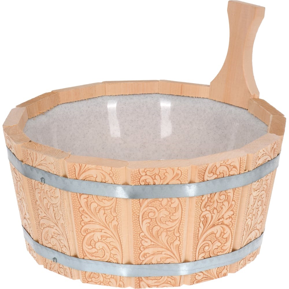 Ушат-шайка с пластиковой вставкой с орнаментом Банные Штучки Цветы 3.5 л 33428 предназначен для бани и сауны. Изготовлен из липы, поэтому долго сохраняет свои природные качества.