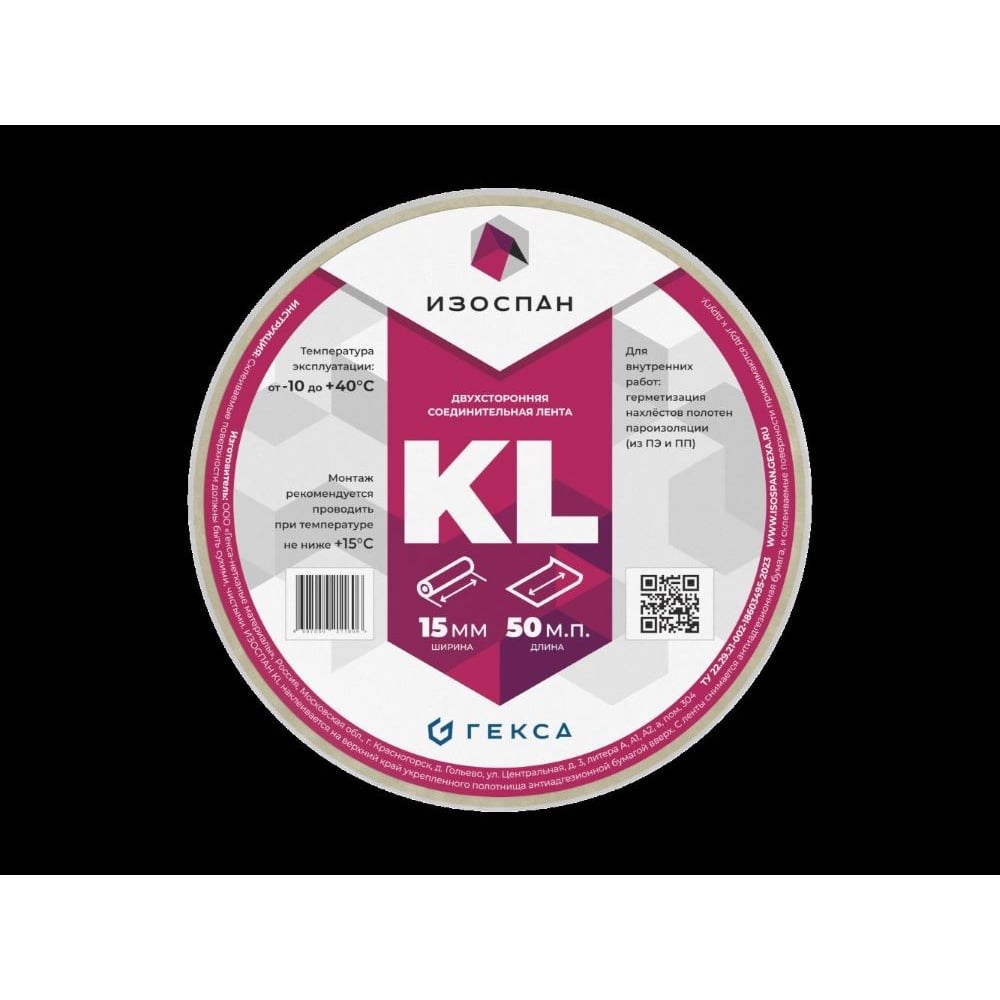 Изоспан KL+ усиленная двусторонняя соединительная лента герметизация нахлестов полотен материалов Изоспан герметизация примыканий полотен материалов Изоспан к другим поверхностям (дерево, бетон, металл, пластик) ОСОБЕННОСТИ универсальна (подходит для герметизации нахлестов и примыканий, для внешних и внутренних работ); обладает высокой адгезией (легко и быстро склеивает поверхности); комфортно монтируется в широком диапазоне температур, в том числе возможен монтаж при отрицательной температуре (минимальная рекомендуемая температура монтажа -10 °C).