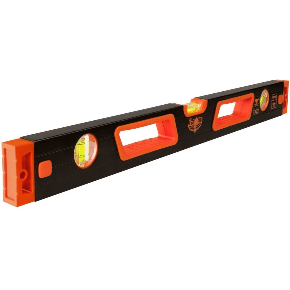 Усиленный фрезерованный уровень с ручками (600 мм, 3 глазка) ВАРЯГ КТ 60-1 40362 тов-165905 представляет собой профессиональный инструмент, который предназначается для выявления отклонений поверхности по горизонтали и вертикали, а также для определения углов 45 градусов. Корпус изделия выполнен из двухкамерного алюминиевого профиля толщиной 2 мм. Двухкомпонентные ручки эргономичной формы способствуют удобству эксплуатации. Для высокой точности измерений глазки прошли электронную проверку и калибровку.