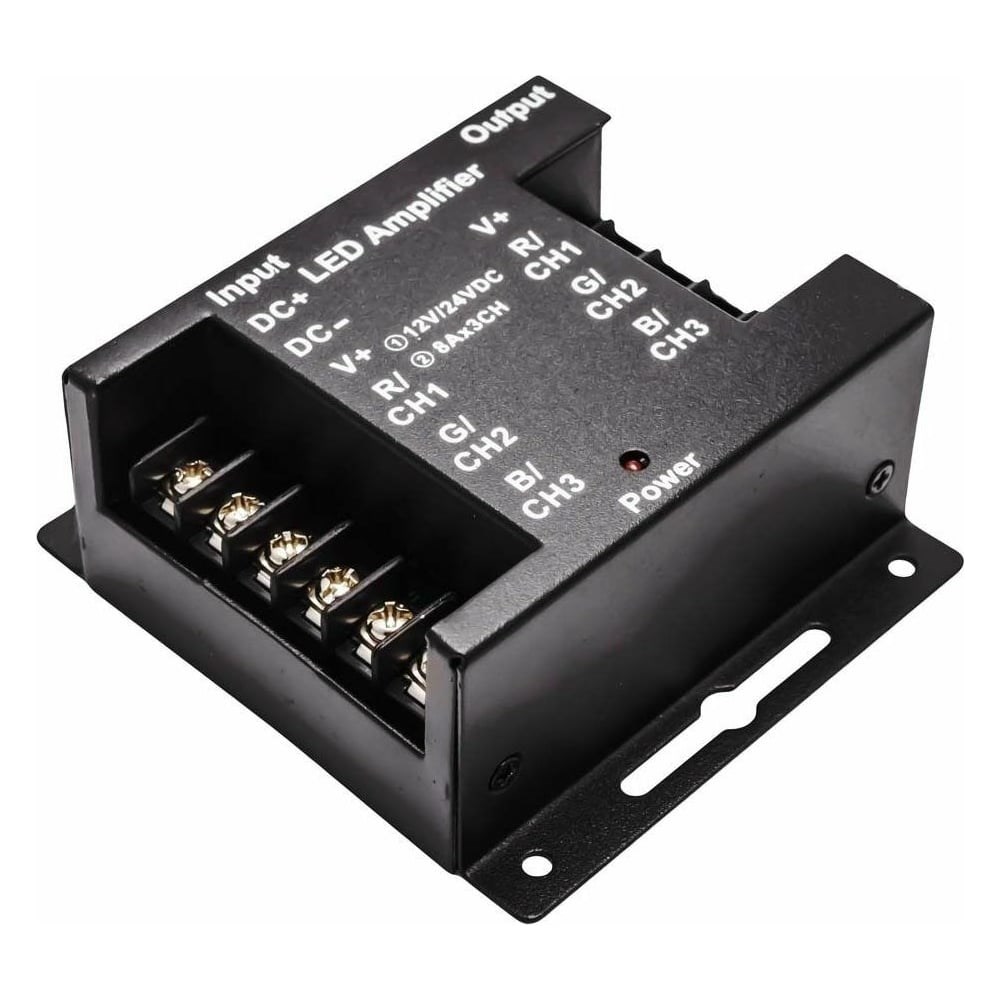Усилитель RGB предназначен для повторения сигнала от RGB контроллера.Прибор позволяет управлять лентой любой длины, при этом будет достаточно одного пульта.Прибор может работать как от напряжения 12 В, так и 24 В. Важно отметить, что в зависимости от того, с каким напряжением предстоит работать устройству, будет отличаться и максимальная мощность нагрузки, которую можно подключить к нему. Так, при напряжении 12 В максимальная нагрузка будет равна 288 Вт, а при напряжении 24 В уже 576 Вт.Усилитель полностью дублирует функционал контроллера, к которому подключен. Благодаря этому светодиодная лента, расположенная в разных зонах, будет синхронно менять свое свечение в соответствии с сигналами пульта, даже если это абсолютно разные зоны.Размер накладного металлического корпуса равен 73х80х33 мм. Степень защиты от пыли и влаги соответствует стандарту IP33, что подразумевает установку устройства в сухом, проветриваемом помещении.
