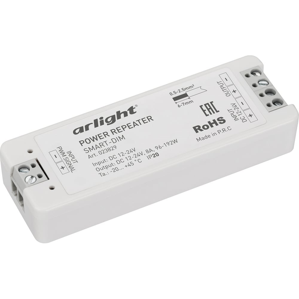 Дополнительные характеристики усилителя Arlight SMART-DIM 0 23829: Материал корпуса - пластик. Каналы управления - 1 CH (1 канал Mono). Ток нагрузки - max: 8A. Выходная мощность - min: 96W; max: 192W. Габариты - 97x33x18 мм.