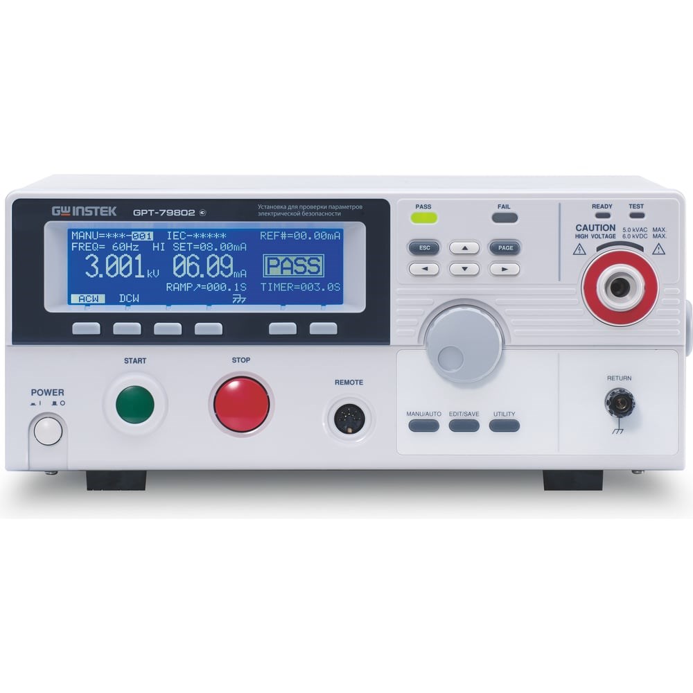 Установка для проверки параметров электрической безопасности GPT-79802Выходная мощность до 200 ВА, вых. усилитель с ШИМ-технологией для повышения энергоэффективности и надежности тестированияИспытание переменным напряжением до 5 кВ. частота 50 ГцИспытание постоянным напряжением до 6 кВВысокое разрешение: 1 мкА - по току, 2 В – по напряжениюУстановка высоковольтного Uтеста при отключенной нагрузке, регулировка высокого напряжения в ходе тестаМикропроцессорное управление, высокая стабильность Uтеста6 клавиш прямого выбора режимов (быстрота и удобство настроек)Режимы тестирования: «Ручной»/ «Авто» (таймер)Графический матричный дисплей с подсветкой (240х64)Световая и звуковая индикация (состояние, результат теста)Разъем «I/O» на передней панели для подключения аналоговых цепей удаленного управления (пуск, останов., результат теста)Память: 100 ячеек для записи профилейИнтерфейс: RS-232, USB