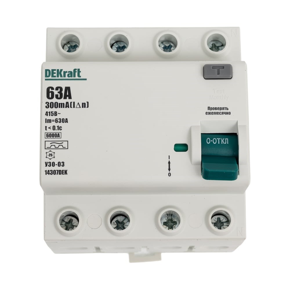 Выключатель дифференциального тока серии УЗО-03 Dekraft4Pноминальный ток 63 Аном.дифф. ток 300 мАэлектромеханическийтип дифференциального расцепителя - AВДТ применяются для защиты человека от поражения электрическим током и электроустановок от риска возникновения пожаров вследствие утечек тока. Конструкция устройств позволяет эксплуатировать их даже при низкой температуре.