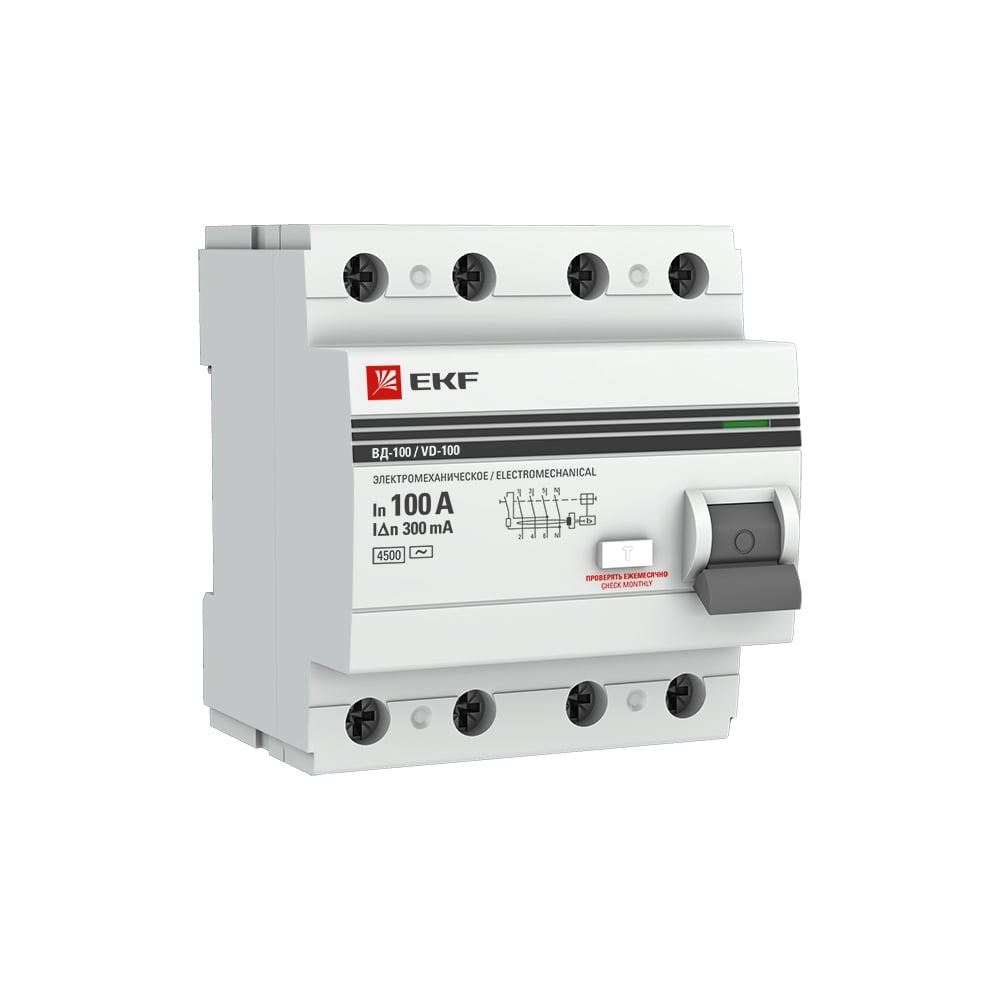 Устройство защитного отключения EKF, УЗО ВД-100, 4P, 100А/300мА, PROxima, SQ elcb-4-100-300-em-pro