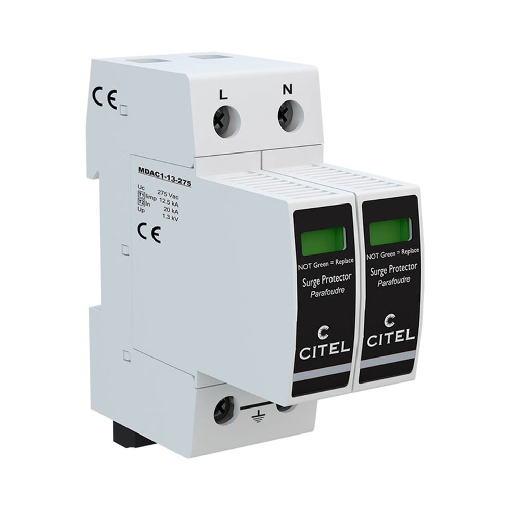 CITEL DAC1-13S-20-275 — двухполюсное устройство защиты от импульсных перенапряжений тип 1+2 для однофазных сетей 230 В с конфигурацией TN. Предназначено для отвода грозовых токов и фильтрации остаточных перенапряжений. Работает на основе варисторной технологии, не создаёт токов утечки и совместимо с УЗО. Устройство оснащено сменными модулями, механической индикацией и перекидным контактом для удалённой сигнализации.Основные характеристики:Тип УЗИП: 1+2, варисторКонфигурация: L/PE и N/PE (2 полюса, TN)Максимальное напряжение (Uc): 275 В ACИмпульсный ток (Iimp): 12,5 кА (10/350 мкс)Максимальный ток разряда (Imax): 50 кАУровень защиты (Up): ≤ 1,3 кВСменные модули: MDAC1-13-275