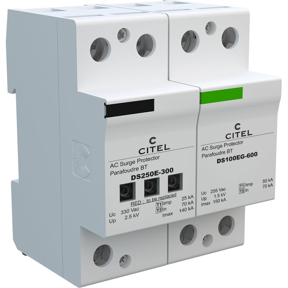 CITEL DS252E-300/G — двухполюсное устройство защиты от импульсных перенапряжений тип 1+2 для однофазных сетей 230 В с конфигурацией TT или TN. Обеспечивает надёжную защиту от прямых ударов молнии и коммутационных перенапряжений в общем и дифференциальном режиме. Оснащено мощными варисторами, встроенным терморазмыкателем, индикацией отключения и перекидным контактом дистанционной сигнализации. Устанавливается на DIN-рейку.Основные характеристики:Тип УЗИП: 1+2, 2 полюса, TT/TNUc: 330 В ACIimp: 25 кА (10/350 мкс), Itotal: 50 кАImax: 140 кА, In: 70 кАUp: ≤ 2,5 кВ (L/N), ≤ 1,5 кВ (N/PE)Контакт сигнализации: перекиднойСтандарты: IEC 61643-11 / ГОСТ / UL1449 Ed.4