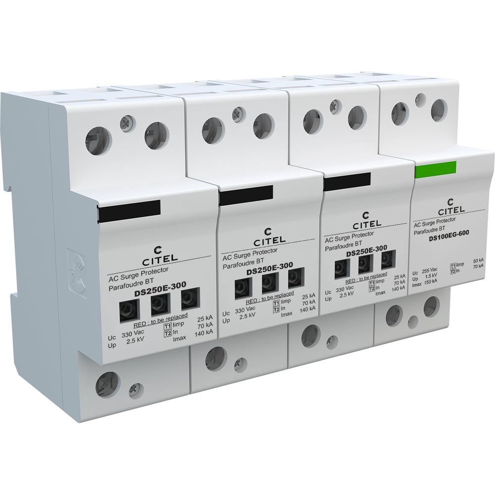 CITEL DS254E-300/G — четырёхполюсное устройство защиты от импульсных перенапряжений тип 1+2 для трёхфазных сетей 230/400 В с конфигурацией TT или TN-S. Обеспечивает полную защиту от грозовых и коммутационных перенапряжений в общем и дифференциальном режимах. Построен на варисторной технологии, оснащён термозащитой, механической индикацией и перекидным контактом для удалённой сигнализации. Установка на DIN-рейку, корпус из самозатухающего пластика.Основные характеристики:Тип УЗИП: 1+2, 4 полюса, TT/TN-SUc: 330 В ACIimp: 25 кА (на полюс), Itotal: 100 кАImax: 140 кА, In: 70 кАUp: 2,5 кВ (L/N), 1,5 кВ (N/PE)Контакт сигнализации: перекиднойСтандарты: IEC 61643-11, UL1449 Ed.4