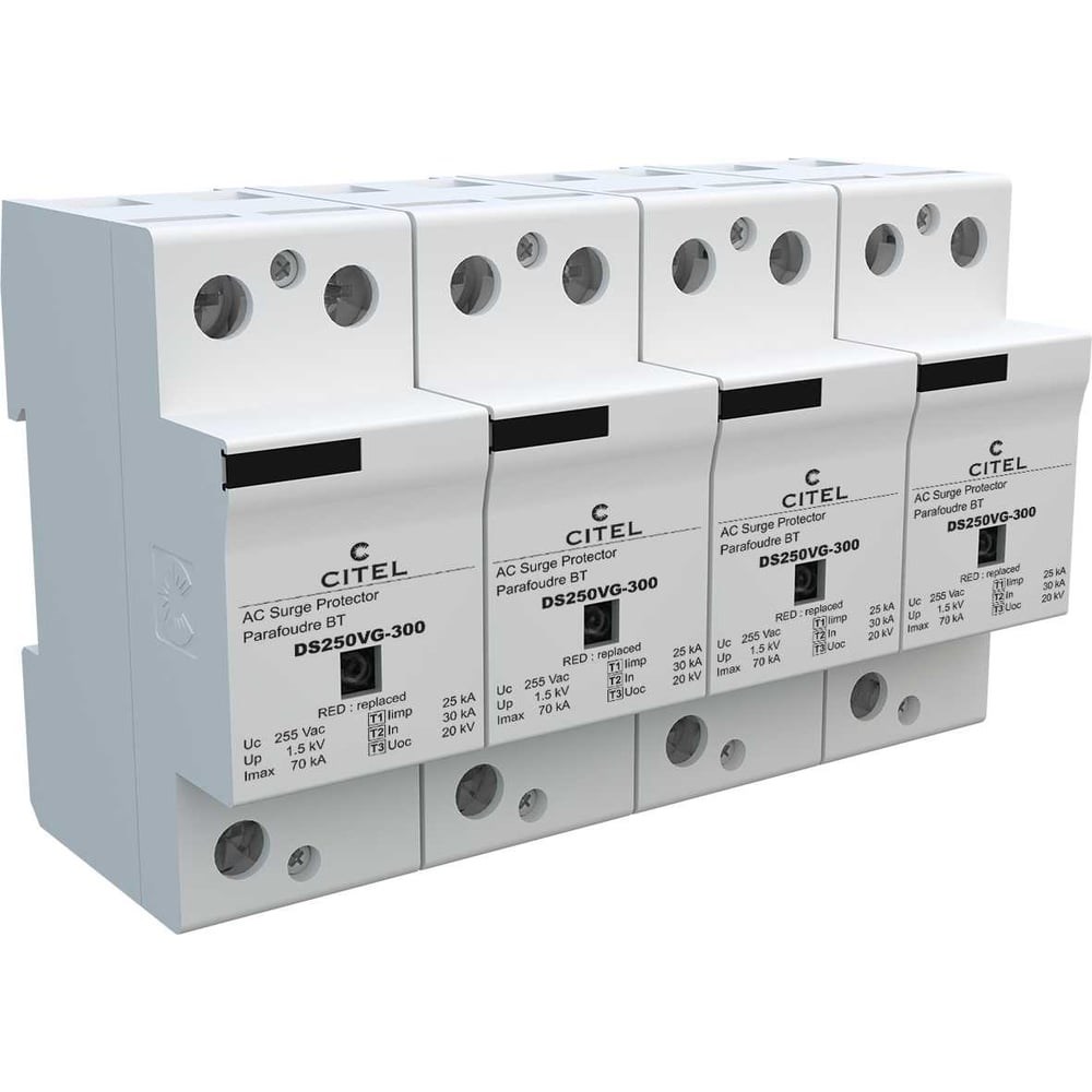 CITEL DS254VG-300 — трёхфазное устройство защиты от импульсных перенапряжений тип 1+2+3, разработанное для сетей 230/400 В AC с системой заземления TN-S. Обеспечивает комплексную защиту от прямых ударов молнии, индустриальных перенапряжений и остаточных импульсов. Построено на технологии VG (варистор + газоразрядник), не создаёт утечек и сопровождающих токов. Оснащено визуальной индикацией состояния, внутренним терморазмыкателем и устанавливается на DIN-рейку.Основные характеристики:Тип УЗИП: 1+2+3, VG-технологияСеть: 3 фазы + нейтраль, TN-SМаксимальное рабочее напряжение (Uc): 255 В ACИмпульсный ток (Iimp): 25 кА (10/350 мкс)Максимальный ток разряда (Imax): 70 кАУровень защиты (Up): ≤ 1,5 кВСертификация: IEC 61643-11, UL1449 Ed.4, EAC