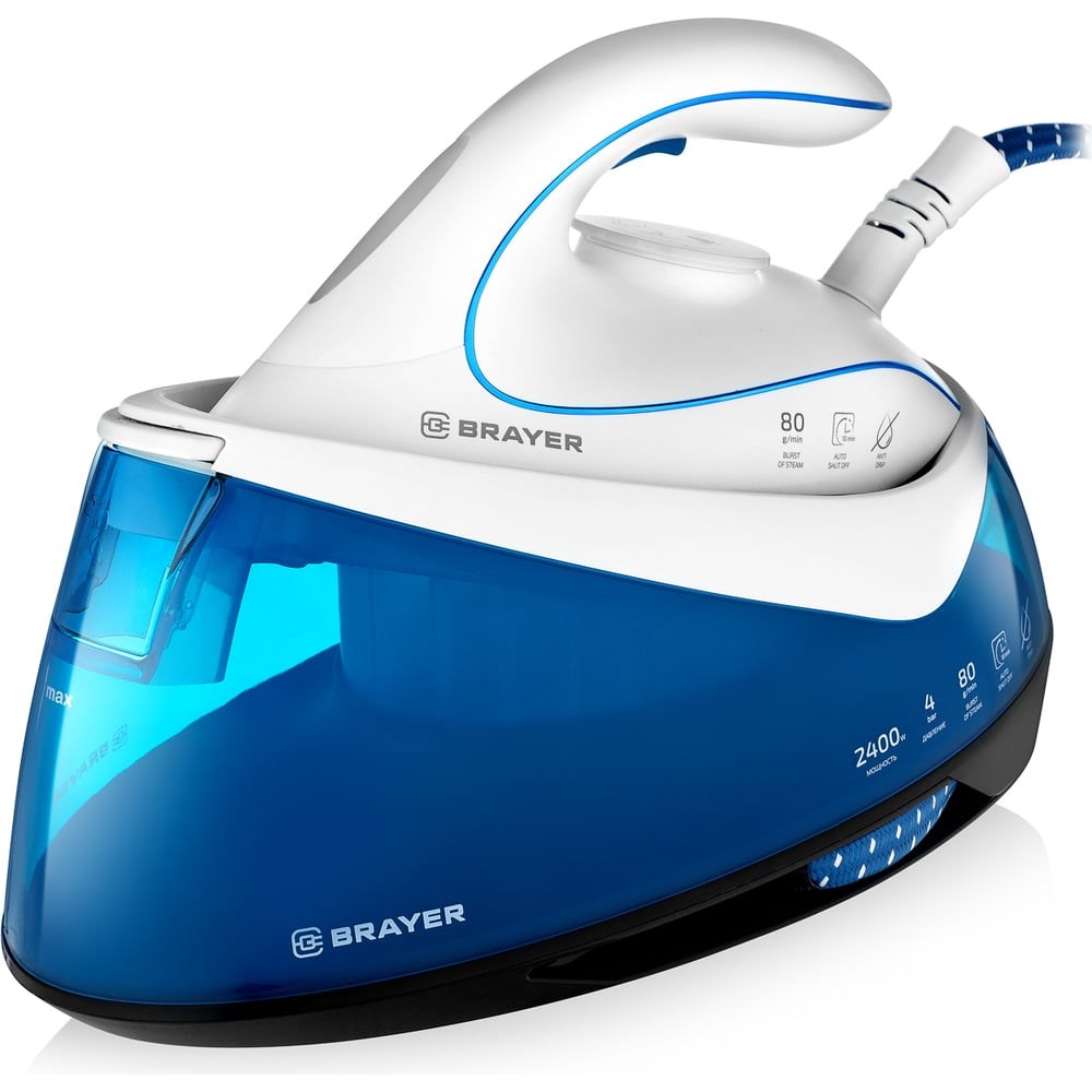 Паровая станция BRAYER BR4150 дополнительные характеристики: Двуслойное керамическое покрытие подошвы, обеспечивающее равномерное распределение температуры Автоматическое отключение Плавная регулировка температуры Встроенная система защиты от накипи Функция самоочистки Функция разбрызгивания Длина шнура 1,8 м
