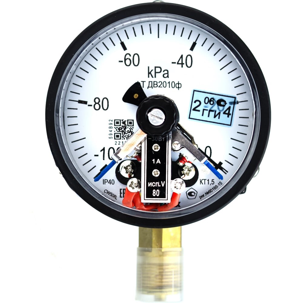 Вакумметры электроконтактные сигнализирующие ДВ2010ф предназначены для измерения вакуумметрического давления некристаллизующихся,неагрессивных по отношению к медным сплавам сред. Посредством сигнализирующего устройства прямого действия могут управлять внешними электрическими цепями путем их замыкания и размыкания при достижении заданного предела давления. Обеспечивают визуальную индикацию контролируемого давления в процессе.Максимальное напряжение коммутируемого тока:220В постоянного тока;380В переменного тока.Сила тока, не более:1А для контактов с магнитным поджатием.Максимальная разрывная мощность контактов:с магнитным поджатием:30Вт постоянного тока;50ВА переменного тока.для скользящих контактов:10Вт постоянного тока;20ВА переменного тока.Пределы допускаемой погрешности срабатывания электроконтактной схемы, % от диапазона показаний:для контактов с магнитным поджатием +/- 4%.