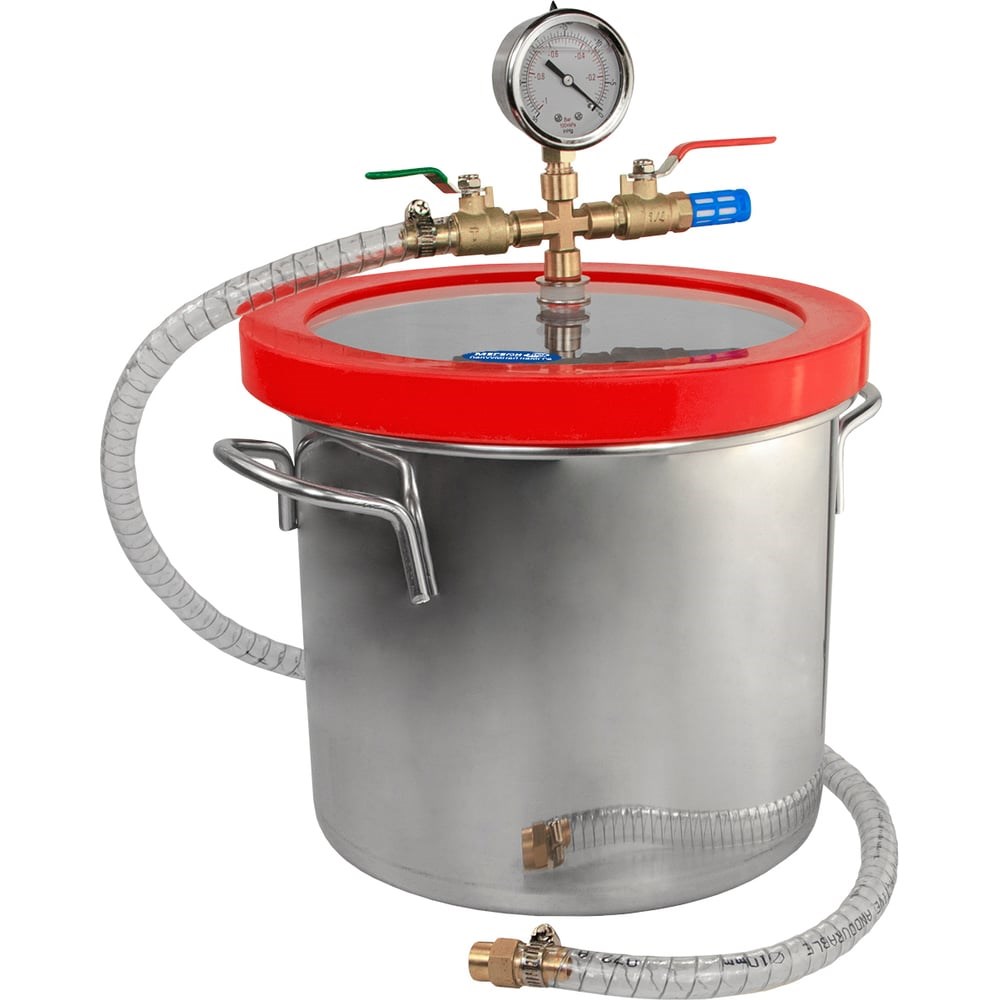 Многоцелевая вакуумная камера объёмом 20 литров, предназначенная для пропитки, стабилизации, окраски, осушения, дегазации, проведения исследований в вакууме и других применений. Емкость изготовлена из нержавеющего сплава стенки которой, имеют оптимальную толщину для работы с нагрузкой до -100 кПа. В качестве материала крышки было применено прозрачное органическое стекло толщиной 19 мм. На крышку установлен коллектор с манометром, двумя кранами, фильтром и двухстороннее силиконовое уплотнение. Всасывающий шланг имеет специальную армировку с целью исключить деформацию при нагнетании разряжения. Изделие идеально подойдет для работы совместно с вакуумирующими насосами моделей МЕГЕОН 98031, 98033 и 98036 (приобретаются отдельно). Оборудование имеет простую и надёжную конструкцию, которую по достоинству смогут оценить любители и профессионалы.