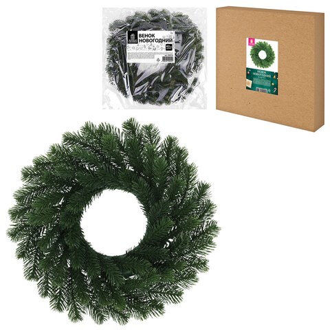 Венок новогодний, диаметром 42 см представляет собой конструкцию из пластикового каркаса и закрепленных к нему ветвей.