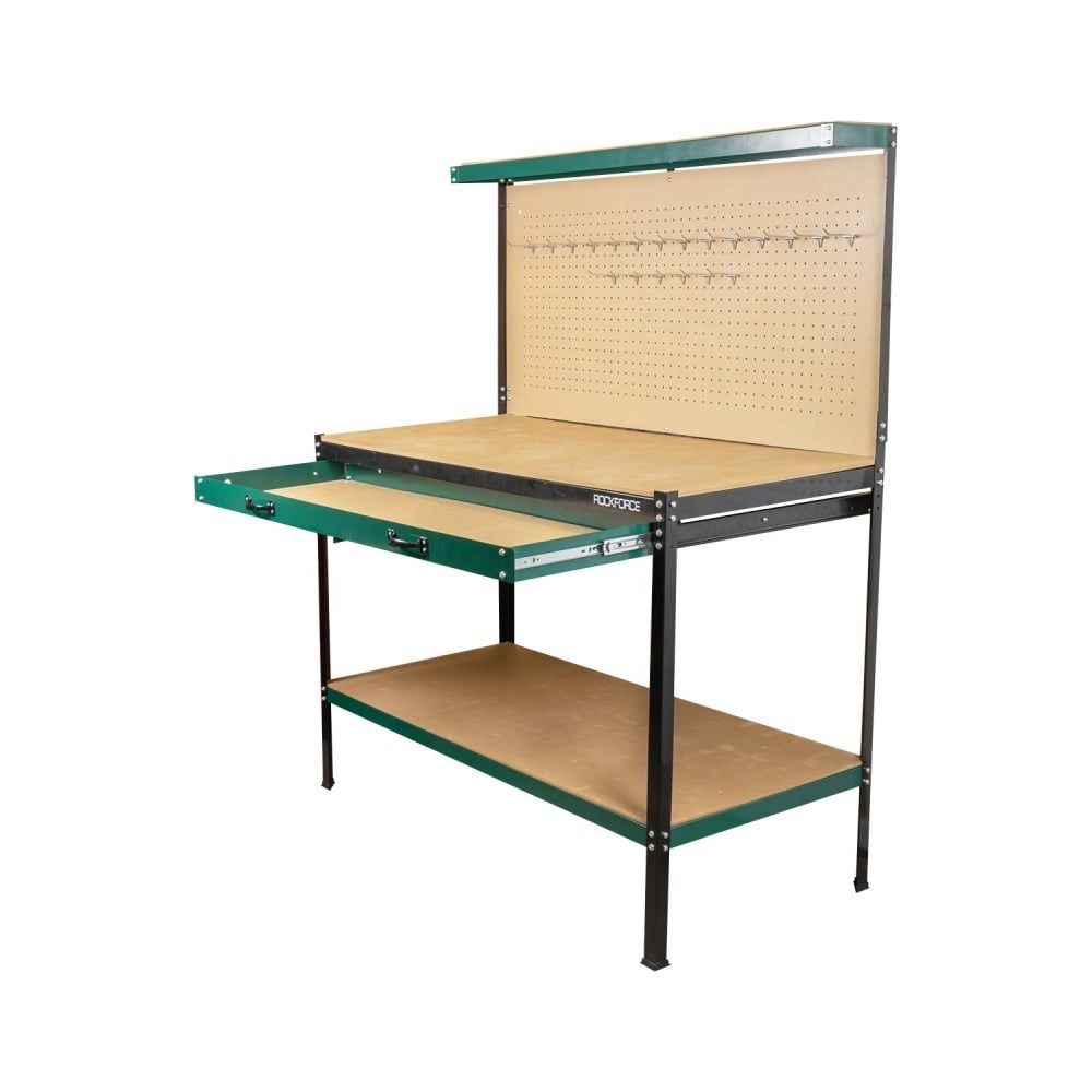 Слесарный верстак Rockforce — это надёжная и функциональная рабочая станция, созданная для профессионального использования. Благодаря прочной конструкции и продуманной организации пространства, он обеспечивает комфорт, безопасность и эффективность при выполнении любых слесарных задач. Размеры 1550×1200×600 мм позволяют удобно разместить инструменты и материалы, а высокая грузоподъёмность делает его универсальным решением для мастерской.Основные характеристики:Габариты верстака: 1550 х 1200 х 600 ммРазмер столешницы: 600 х 1200 ммМаксимальная нагрузка на столешницу: до 120 кгНагрузка на полку: до 80 кгВыдвижная полка: выдерживает нагрузку до 20 кгКрючки для хранения инструмента: 30 штук в комплектеПреимущества:Прочная конструкция Изготовлен из надёжных материалов, выдерживает значительные нагрузки и обеспечивает долгий срок службы.Усиленная столешница (120 кг) Позволяет безопасно работать с тяжёлыми деталями и инструментами.Дополнительные полки (80 кг и 20 кг) Удобное хранение крупного и мелкого инструмента без загромождения рабочей зоны.30 крючков в комплекте Организованное хранение — всё под рукой, без лишнего поиска.Стабильность при работе Устойчивая конструкция исключает смещение или покачивание, даже при интенсивной нагрузке.