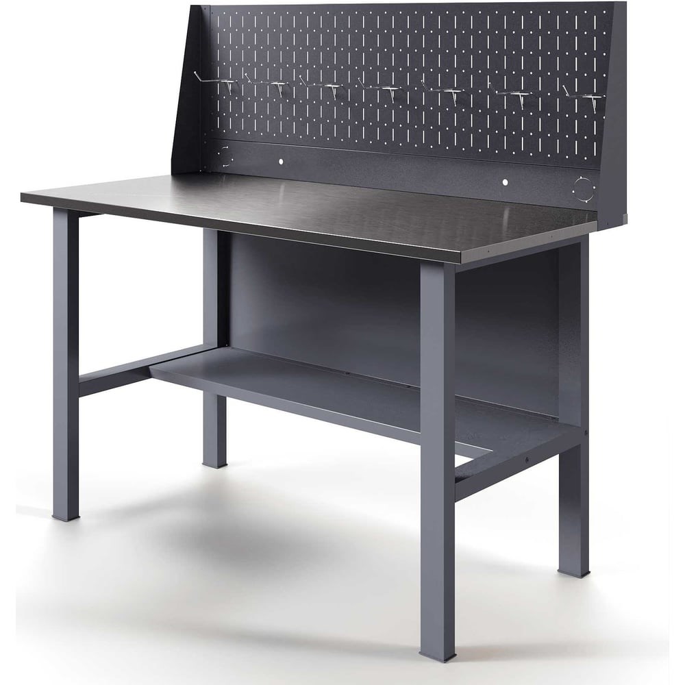 Верстак-стол - устойчивый, удобный, для слесарных, столярных работ, для производств и мастерских. Поставляется в разобранном виде. Крепкая и надежная конструкция столешницы из дерева и металла выдерживает нагрузку до 300 кг. Специальное полимерное покрытие на ножках и полке защищает от коррозии и придает столу эстетичный вид. Надежная и прочная конструкция стола , позволяет выполнять даже силовые операции с инструментом и металлоизделиями. Столешница представляет собою плиту из фанеры толщиной 24 мм, закрытую коробом из оцинкованного листа толщиной 1,2 мм. Конструкции столешницы и короба разработаны таким образом, чтобы после сборки верстака на его рабочей поверхности отсутствовали неиспользуемые отверстия для крепежных элементов, головки болтов, заклепок и т. д. Поверхность столешниц идеально ровная. Это обеспечивает дополнительный комфорт пользователю. Опора для верстаков и столов из холоднокатаной стали 1,5 мм, согнутой в П-образный профиль. Цвет серый RAL 7024. Перфорированная панель служит для размещения инструментов, крепежа и расходных материалов. Отверстия имеют диаметр 5 мм с шагом перфорации 50 мм. Перфорированная панель комплектуется дополнительной панелью для установки розеток, тумблеров и выводов компрессора.