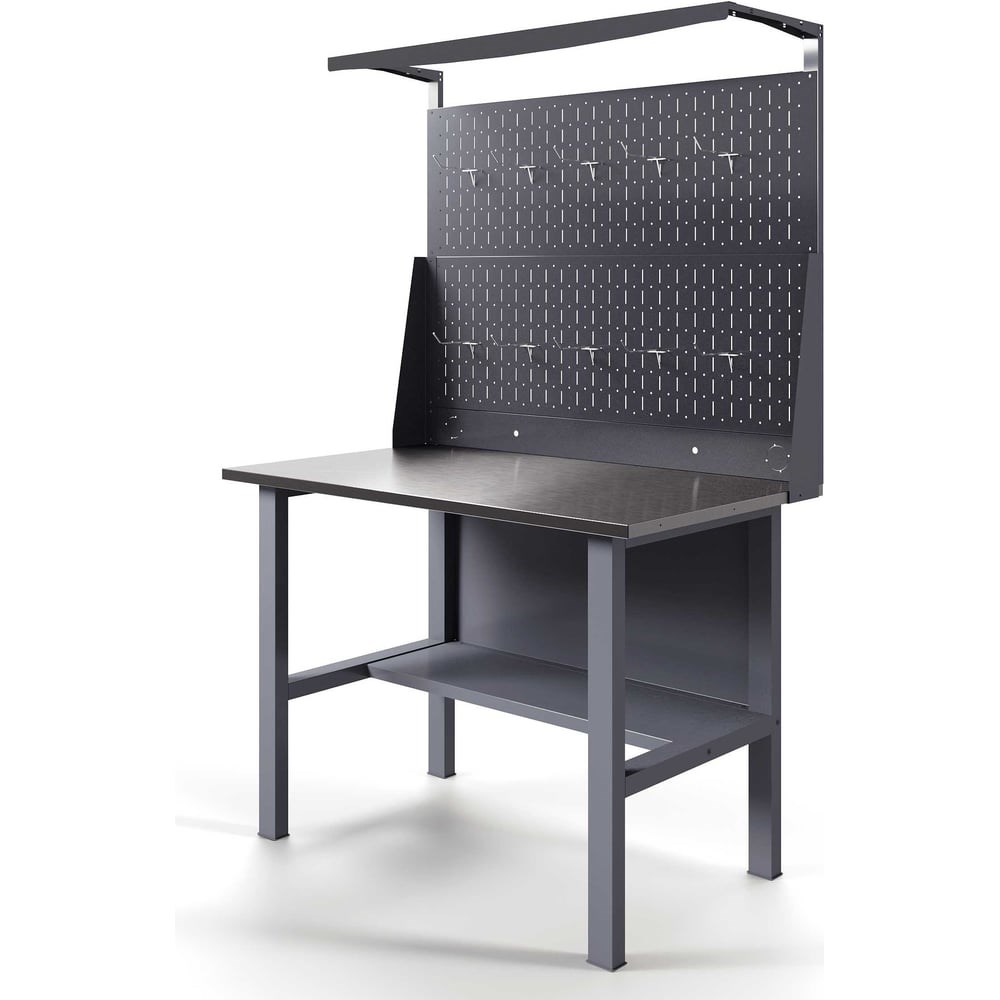 Верстак-стол - устойчивый, удобный, для слесарных, столярных работ, для производств и мастерских. Поставляется в разобранном виде. Крепкая и надежная конструкция столешницы из дерева и металла выдерживает нагрузку до 300 кг. Специальное полимерное покрытие на ножках и полке защищает от коррозии и придает столу эстетичный вид. Надежная и прочная конструкция стола , позволяет выполнять даже силовые операции с инструментом и металлоизделиями. Столешница представляет собою плиту из фанеры толщиной 24 мм, закрытую коробом из оцинкованного листа толщиной 1,2 мм. Конструкции столешницы и короба разработаны таким образом, чтобы после сборки верстака на его рабочей поверхности отсутствовали неиспользуемые отверстия для крепежных элементов, головки болтов, заклепок и т. д. Поверхность столешниц идеально ровная. Это обеспечивает дополнительный комфорт пользователю. Опора для верстаков и столов из холоднокатаной стали 1,5 мм, согнутой в П-образный профиль. Цвет серый RAL 7024. Перфорированная панель служит для размещения инструментов, крепежа и расходных материалов. Отверстия имеют диаметр 5 мм с шагом перфорации 50 мм. Перфорированная панель комплектуется дополнительной панелью для установки розеток, тумблеров и выводов компрессора, а так же козырьком для установки лампы освещения.