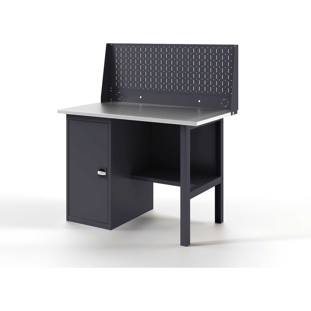 Верстак-стол - устойчивый, удобный, для слесарных, столярных работ, для производств и мастерских. Поставляется в разобранном виде. Крепкая и надежная конструкция столешницы из дерева и металла выдерживает нагрузку до 300 кг. Специальное полимерное покрытие на ножках и полке защищает от коррозии и придает столу эстетичный вид. Надежная и прочная конструкция стола , позволяет выполнять даже силовые операции с инструментом и металлоизделиями. Столешница представляет собою плиту из фанеры толщиной 24 мм, закрытую коробом из оцинкованного листа толщиной 1,2 мм. Конструкции столешницы и короба разработаны таким образом, чтобы после сборки верстака на его рабочей поверхности отсутствовали неиспользуемые отверстия для крепежных элементов, головки болтов, заклепок и т. д. Поверхность столешниц идеально ровная. Это обеспечивает дополнительный комфорт пользователю. Опора для верстаков и столов из холоднокатаной стали 1,5 мм, согнутой в П-образный профиль. Цвет серый RAL 7024. Перфорированная панель служит для размещения инструментов, крепежа и расходных материалов. Отверстия имеют диаметр 5 мм с шагом перфорации 50 мм. Перфорированная панель комплектуется дополнительной панелью для установки розеток, тумблеров и выводов компрессора.