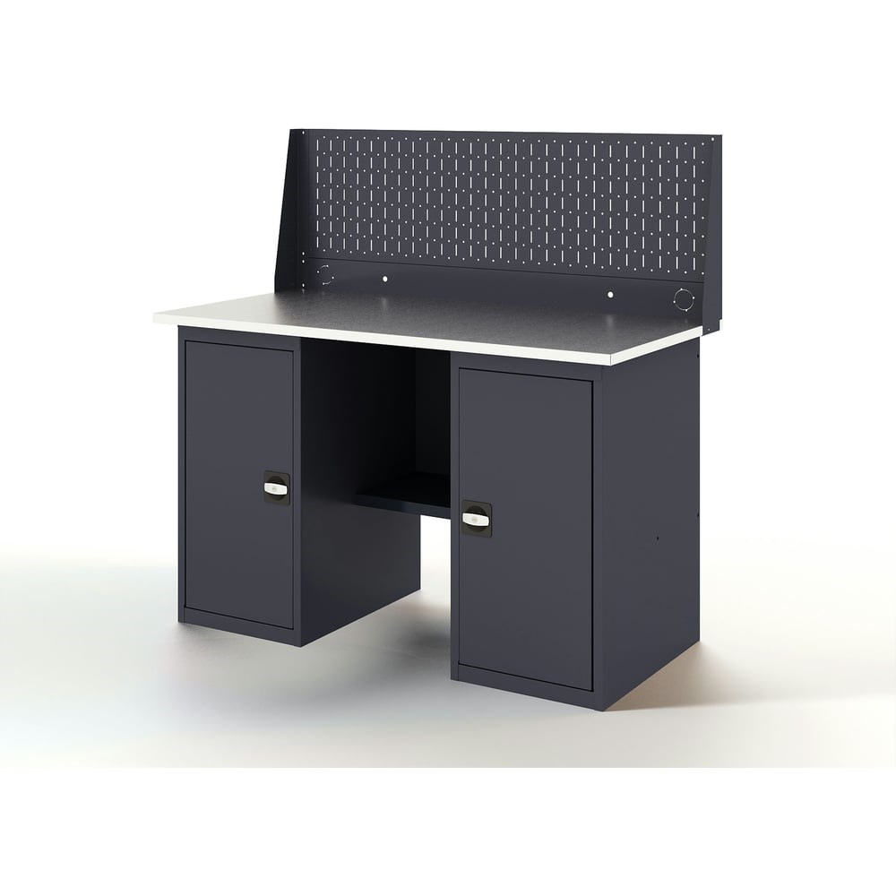 Верстак-стол - устойчивый, удобный, для слесарных, столярных работ, для производств и мастерских. Поставляется в разобранном виде. Крепкая и надежная конструкция столешницы из дерева и металла выдерживает нагрузку до 300 кг. Специальное полимерное покрытие на ножках и полке защищает от коррозии и придает столу эстетичный вид. Надежная и прочная конструкция стола , позволяет выполнять даже силовые операции с инструментом и металлоизделиями. Столешница представляет собою плиту из фанеры толщиной 24 мм, закрытую коробом из оцинкованного листа толщиной 1,2 мм. Конструкции столешницы и короба разработаны таким образом, чтобы после сборки верстака на его рабочей поверхности отсутствовали неиспользуемые отверстия для крепежных элементов, головки болтов, заклепок и т. д. Поверхность столешниц идеально ровная. Это обеспечивает дополнительный комфорт пользователю. Опора для верстаков и столов из холоднокатаной стали 1,5 мм, согнутой в П-образный профиль. Цвет серый RAL 7024. Перфорированная панель служит для размещения инструментов, крепежа и расходных материалов. Отверстия имеют диаметр 5 мм с шагом перфорации 50 мм. Перфорированная панель комплектуется дополнительной панелью для установки розеток, тумблеров и выводов компрессора.