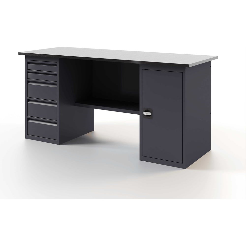Верстак-стол - устойчивый, удобный, для слесарных, столярных работ, для производств и мастерских. Поставляется в разобранном виде. Крепкая и надежная конструкция столешницы из дерева и металла выдерживает нагрузку до 300 кг. Специальное полимерное покрытие на тумбах и полке защищает от коррозии и придает столу эстетичный вид. Надежная и прочная конструкция стола , позволяет выполнять даже силовые операции с инструментом и металлоизделиями. Столешница представляет собою плиту из МДФ толщиной 24мм, закрытую коробом из оцинкованного листа толщиной 1, 2 мм. Конструкции столешницы и короба разработаны таким образом, чтобы после сборки верстака на его рабочей поверхности отсутствовали неиспользуемые отверстия для крепежных элементов, головки болтов, заклепок и т. д. Поверхность наших столешниц идеально ровная. Это обеспечивает дополнительный комфорт пользователю. Цвет серый RAL 7024.