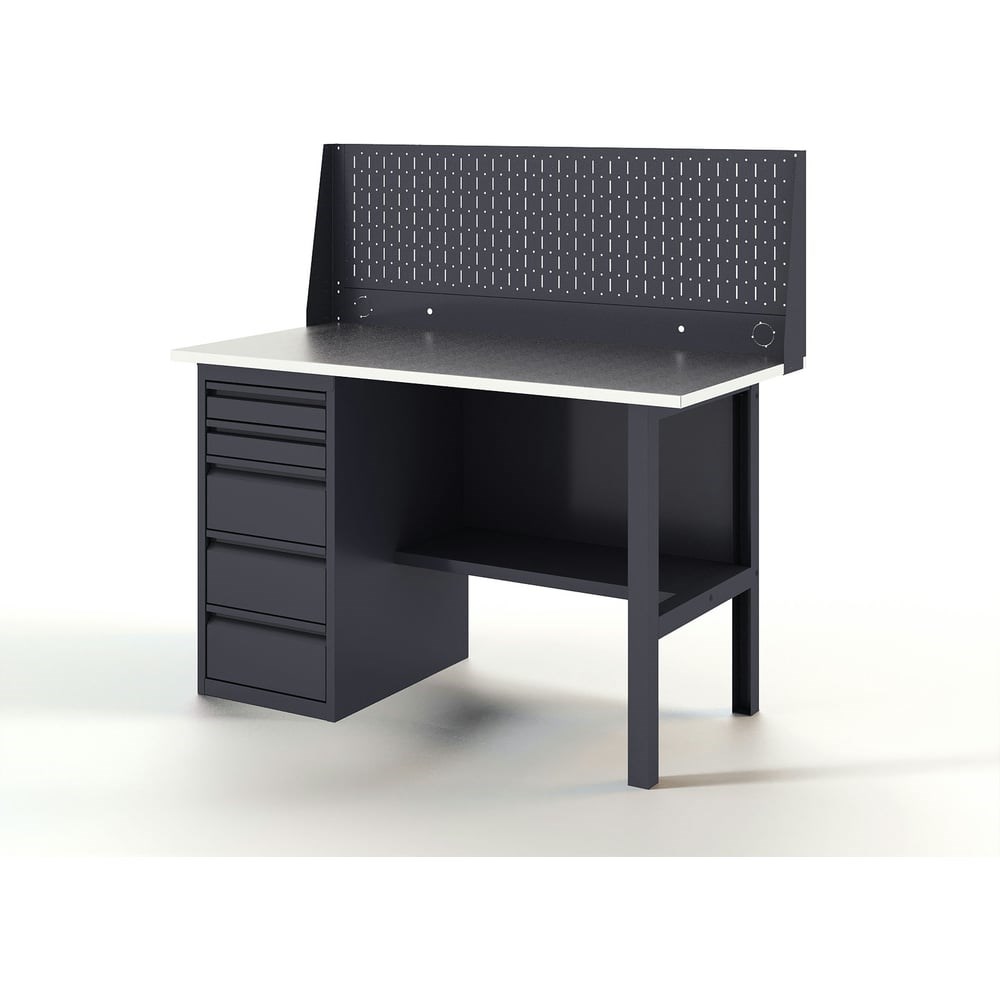 Верстак-стол - устойчивый, удобный, для слесарных, столярных работ, для производств и мастерских. Поставляется в разобранном виде. Крепкая и надежная конструкция столешницы из дерева и металла выдерживает нагрузку до 300 кг. Специальное полимерное покрытие на ножках и полке защищает от коррозии и придает столу эстетичный вид. Надежная и прочная конструкция стола , позволяет выполнять даже силовые операции с инструментом и металлоизделиями. Столешница представляет собою плиту из фанеры толщиной 24 мм, закрытую коробом из оцинкованного листа толщиной 1,2 мм. Конструкции столешницы и короба разработаны таким образом, чтобы после сборки верстака на его рабочей поверхности отсутствовали неиспользуемые отверстия для крепежных элементов, головки болтов, заклепок и т. д. Поверхность столешниц идеально ровная. Это обеспечивает дополнительный комфорт пользователю. Опора для верстаков и столов из холоднокатаной стали 1,5 мм, согнутой в П-образный профиль. Цвет серый RAL 7024. Перфорированная панель служит для размещения инструментов, крепежа и расходных материалов. Отверстия имеют диаметр 5 мм с шагом перфорации 50 мм. Перфорированная панель комплектуется дополнительной панелью для установки розеток, тумблеров и выводов компрессора.