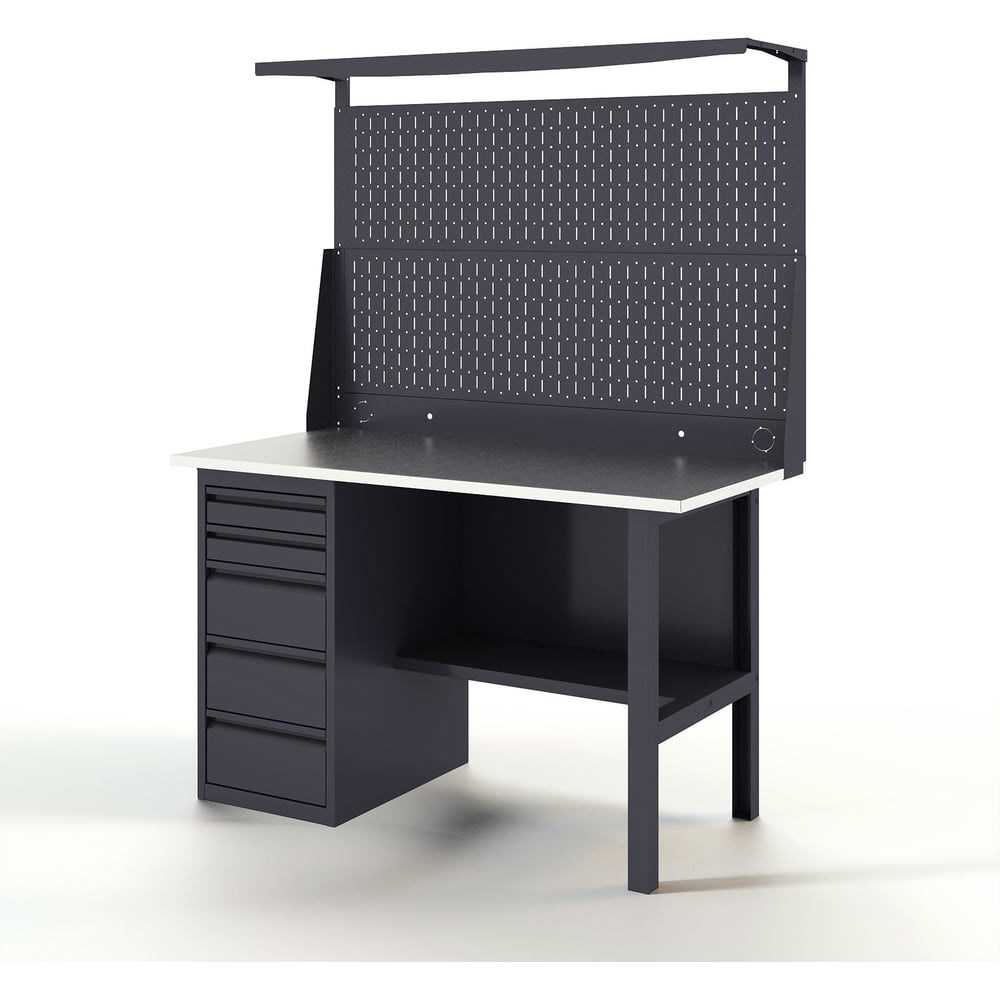 Верстак-стол - устойчивый, удобный, для слесарных, столярных работ, для производств и мастерских. Поставляется в разобранном виде. Крепкая и надежная конструкция столешницы из дерева и металла выдерживает нагрузку до 300 кг. Специальное полимерное покрытие на ножках и полке защищает от коррозии и придает столу эстетичный вид. Надежная и прочная конструкция стола , позволяет выполнять даже силовые операции с инструментом и металлоизделиями. Столешница представляет собою плиту из фанеры толщиной 24 мм, закрытую коробом из оцинкованного листа толщиной 1,2 мм. Конструкции столешницы и короба разработаны таким образом, чтобы после сборки верстака на его рабочей поверхности отсутствовали неиспользуемые отверстия для крепежных элементов, головки болтов, заклепок и т. д. Поверхность столешниц идеально ровная. Это обеспечивает дополнительный комфорт пользователю. Опора для верстаков и столов из холоднокатаной стали 1,5 мм, согнутой в П-образный профиль. Цвет серый RAL 7024. Перфорированная панель служит для размещения инструментов, крепежа и расходных материалов. Отверстия имеют диаметр 5 мм с шагом перфорации 50 мм. Перфорированная панель комплектуется дополнительной панелью для установки розеток, тумблеров и выводов компрессора, а так же козырьком для установки лампы освещения.