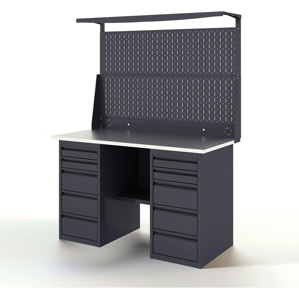 Верстак-стол - устойчивый, удобный, для слесарных, столярных работ, для производств и мастерских. Поставляется в разобранном виде. Крепкая и надежная конструкция столешницы из дерева и металла выдерживает нагрузку до 300 кг. Специальное полимерное покрытие на ножках и полке защищает от коррозии и придает столу эстетичный вид. Надежная и прочная конструкция стола , позволяет выполнять даже силовые операции с инструментом и металлоизделиями. Столешница представляет собою плиту из фанеры толщиной 24 мм, закрытую коробом из оцинкованного листа толщиной 1,2 мм. Конструкции столешницы и короба разработаны таким образом, чтобы после сборки верстака на его рабочей поверхности отсутствовали неиспользуемые отверстия для крепежных элементов, головки болтов, заклепок и т. д. Поверхность столешниц идеально ровная. Это обеспечивает дополнительный комфорт пользователю. Опора для верстаков и столов из холоднокатаной стали 1,5 мм, согнутой в П-образный профиль. Цвет серый RAL 7024. Перфорированная панель служит для размещения инструментов, крепежа и расходных материалов. Отверстия имеют диаметр 5 мм с шагом перфорации 50 мм. Перфорированная панель комплектуется дополнительной панелью для установки розеток, тумблеров и выводов компрессора, а так же козырьком для установки лампы освещения.