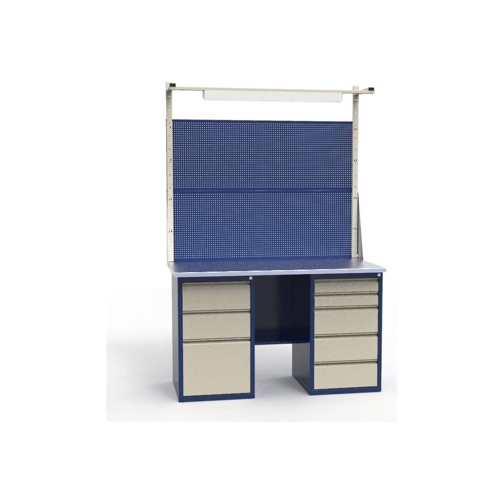 Верстак Святогор – это рабочий стол для слесарей. Он выдерживает большую нагрузку: до 1 тонны. Модель подойдет для использования в мастерских, автомастерских и на заводах, где к слесарным верстакам применяются особые требования по нагрузке. Все детали, изготовленные из холоднокатаной стали толщиной 1 мм, окрашены порошковыми эпокси-полиэфирными глянцевыми красками, что позволяет легко удалять загрязнения с поверхности. Столешница выполнена из фанеры толщиной 21 мм и оцинкованного листа толщиной 2 мм. В тумбе с выдвижными ящиками установлены шариковые телескопические направляющие, обеспечивающие плавное выдвижение.