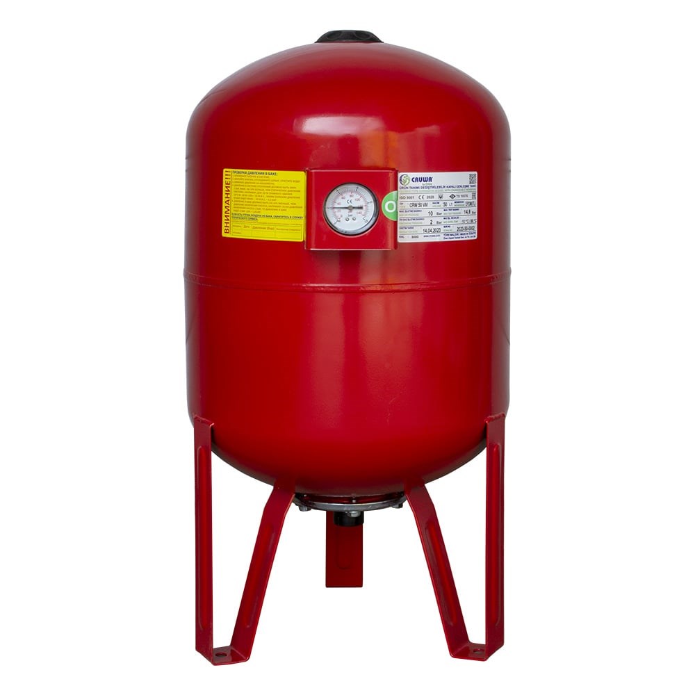 Расширительный бак/гидроаккумулятор CRUWA CRW 50 VMRED, в вертикальном исполнении, напольный, с ножками и манометром, с максимальным рабочим давлением 10 бар, укомплектован заменяемой мембраной EPDM, предназначен для систем водоснабжения, ГВС, отопления и охлаждения.