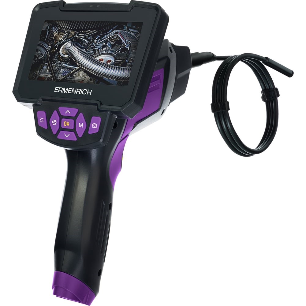 Технический эндоскоп Ermenrich Seek VE40 Эрменрих предназначен для осмотра трудноступных мест при ремонте трубопроводов и систем вентиляции, обслуживании промышленного оборудования и автомобилей, строительстве зданий. Эндоскоп оснащен цветным ЖК-дисплеем с диагональю 4,3". На полужестком кабеле расположена камера для фотосъемки в качестве 1280x720 пикс и записи видео в качестве 640x480 пикс.Эта модель поставляется с кабелем длиной 1 метр и имеет одну камеру прямого обзора. Камера позволяет вести наблюдение с углом 70° в любое время суток, подсветка осуществляется 6 светодиодами с регулируемой яркостью. На панели управления расположены кнопки навигации по меню, отдельная кнопка для съемки фото и видео, кнопка настройки яркости подсветки. Панель крепится на удобную нескользящую ручку.Есть возможность сохранять фото и видеозаписи на карты памяти microSD объемом до 64 ГБ. Питание осуществляется от литий-ионной аккумуляторной батареи емкостью 1700 мАч, заряда которой хватает примерно на 3 часа автономной работы. Адаптер для подзарядки эндоскопа от сети не входит в комплект, его можно заказать отдельно. Степень защиты камеры IP67, допускается погружение в воду (например, при осмотре канализационных труб).