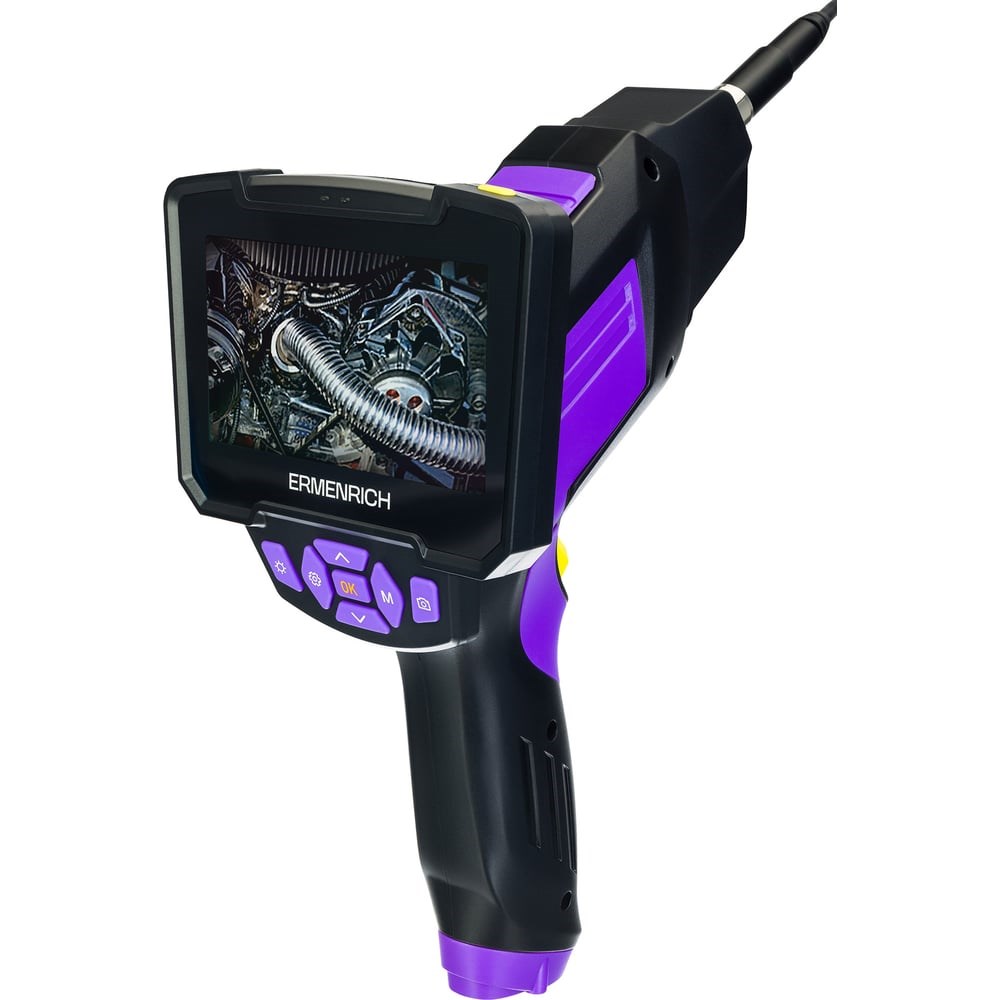 Бороскоп Ermenrich Seek VE70 с полужестким кабелем длиной 10 м и с двумя камерами высокого разрешения – фронтальной диаметром 8 мм и боковой диаметром 4,5 мм. Тонкий кабель длиной 10 м можно быстро завести в труднодоступное место, например, при ремонте трубопровода или автомобильного двигателя. Обе камеры имеют светодиодную подсветку, угол обзора составляет 70°. Степень защиты камер и ламп подсветки IP67, поэтому их можно использовать даже под водой (в течение небольшого времени). На панели управления расположены ЖК-дисплей с диагональю 4,3", индикаторы рабочего состояния и заряда аккумулятора, функциональные кнопки. С помощью кнопок можно выбирать пункты меню, регулировать яркость подсветки, делать фотоснимки в разрешении 1280x720 пикс и записывать видеоролики в разрешении 640x480 пикс. Дисплей установлен на основной блок с удобной нескользящей ручкой. В устройство можно установить карту памяти microSD для записи данных объемом до 64 ГБ (не входит в комплект). Эндоскоп работает от встроенной аккумуляторной батареи емкостью 1700 мАч, заряда хватает на 3 часа работы. Зарядное устройство для аккумулятора не входит в комплект. Прибор комплектуется тремя насадками: крюком, магнитом и защитной крышкой.