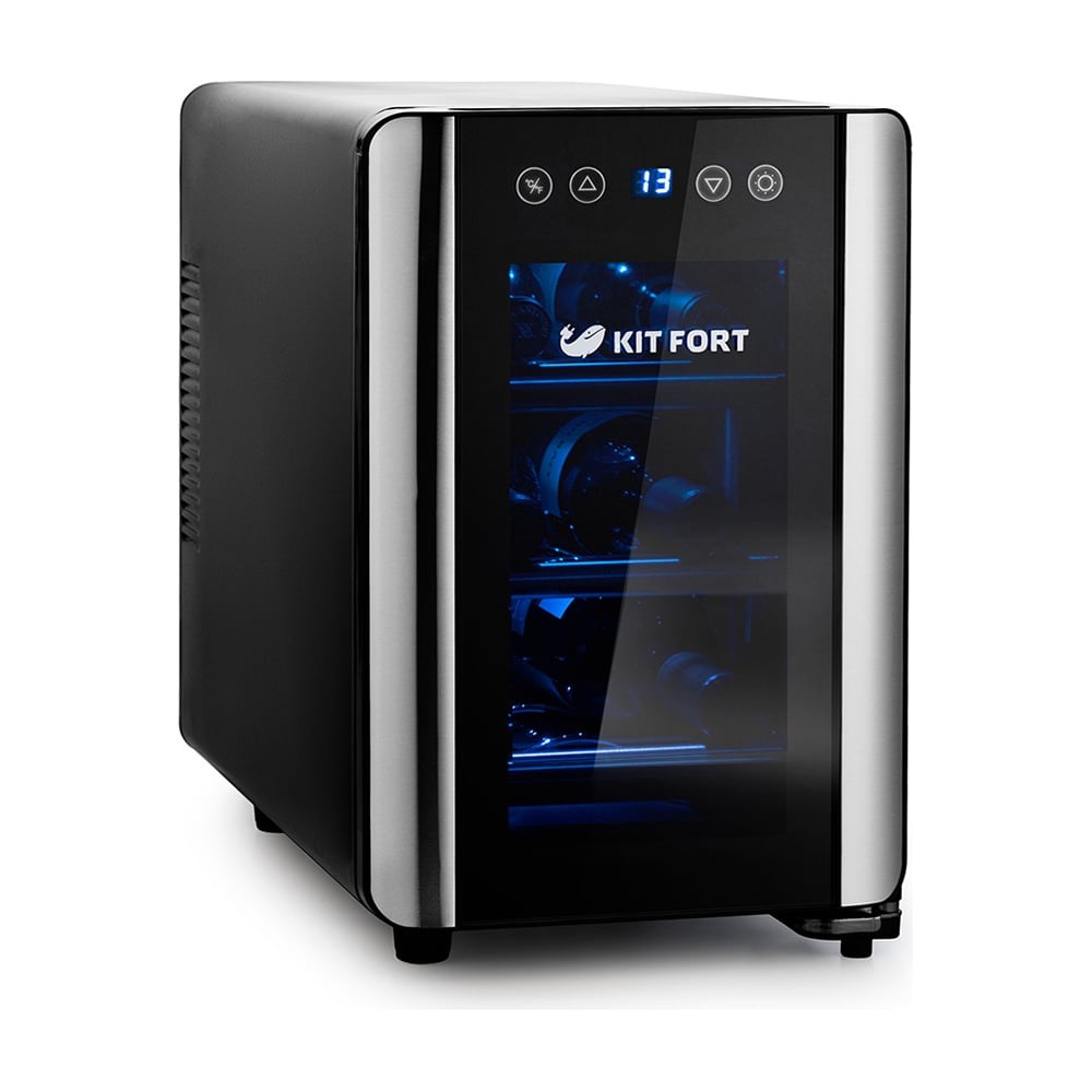 Винный шкаф KITFORT КТ-2401 предназначен для правильного хранения вина, подаренного друзьями, привезенного из-за границы или купленного по случаю. Рабочий температурный диапазон винного шкафа выставляется в пределах от 8 до 18 °С с шагом в 1 °С. Дверца шкафа из тонированного стекла не пропускает УФ-излучение, что исключает вероятность окисления вина. В верхней её части расположена сенсорная панель управления со светодиодным дисплеем. Лампа подсветки светит неярким синим светом, чтобы исключить его воздействие на бутылки с вином.