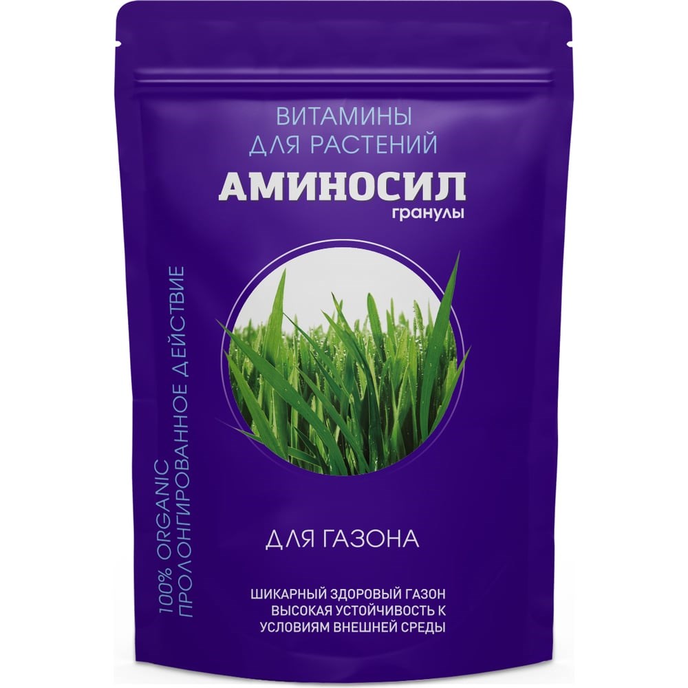 Витамины для газона АМИНОСИЛ в гранулах - комплексное питание, которое обеспечивает посевной и рулонный газон всеми необходимыми витаминами, макро- и микроэлементами. Идеально подходит для ухода, питания и удобрения всех видов газонных трав: универсального, спортивного, низкорослого, декоративного, теневыносливого и прочих.Витамины для газона АМИНОСИЛ в гранулах: выступают как стимулятор роста корневой системы; способствуют быстрому укоренению посевных газонов и приживаемости рулонных газонов; препятствуют распространению мха и сорных растений; обеспечивают интенсивную ярко-зеленую окраску газона в течение всего сезона; повышают устойчивость газона к засухе и заморозку; подходят для весенне-летнего периода; имеют 100% органический состав - безопасно для людей и животных.СХЕМА ВНЕСЕНИЯ: Посев: -перед посевом семян внести гранулы по поверхности очищенного от сорняков и мусора грунта; -после внесения заделать гранулы в грунт на глубину не более 2 см; -произвести посев семян газонной смеси; -семена заделать в почву на глубину не более 1 см и прикатать; -обильно полить засеянный участок; -следующую подкормку рекомендуется производить не раньше, чем через 2 месяца. Регулярное питание: -равномерно распределить гранулы по поверхности грунта; -заделать в почву на глубину до 5 см или присыпать новым грунтом; -тщательно полить грунт.Состав: Азот - 2,5%, Фосфор - 1,5%, Калий - 1,5%, магний, железо, кальций, медь, цинк, марганец, сера, бор, молибден, гуминовые вещества