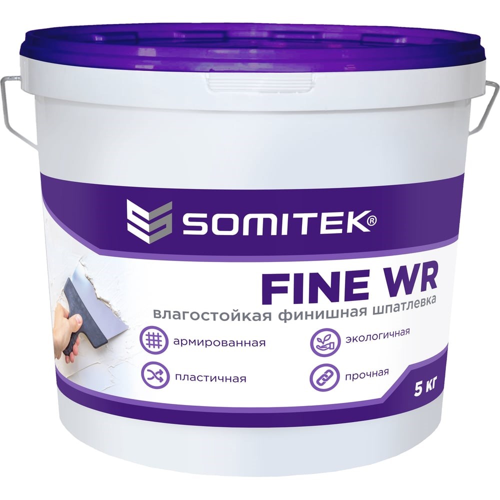 Влагостойкая финишная шпатлевка SOMITEK fine wr 5 кг 36009 предназначена для финишного выравнивания стен и потолков в помещениях с повышенной влажностью (кухни, ванные комнаты) и подготовки поверхностей под покраску, оклейку обоями, для нанесения декоративной штукатурки и других отделочных материалов. Армированная целлюлозным волокном, имеет отличную адгезию ко всем строительным основаниям (бетон, штукатурки, ГКЛ, кирпич, керамика, дерево и т.д.) и не требует предварительного грунтования основы. После полного высыхания приобретает высокую прочность и не боится перепадов температур. Применяется только для внутренних работ.