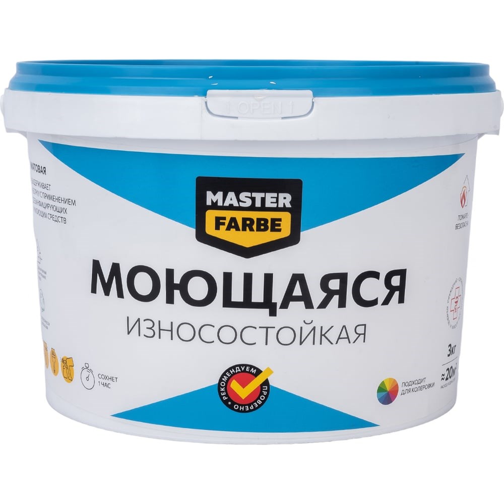 Водно-дисперсионная краска для помещений с высокой эксплуатационной нагрузкой MASTERFARBE (моющаяся; износостойкая; белая; 3 кг) 4631159427569 используется для окраски стен и потолков в помещениях, подверженных загрязнению и требующих влажную уборку при помощи неабразивных моющих и дезинфицирующих средств: школы, детские дошкольные и спортивные учреждения, больницы.Преимущества:Без запаха, разбавляется водойКолеруется красителями для ВД красок и колеровочными системамиВыдерживает влажную уборку и дезинфекциюСертифицирована для детских и лечебных учреждений RU.01.PA.02.015.E.000715.07.20Пожаробезопасна, класс пожарной опасности КМ1 сертификат RU C