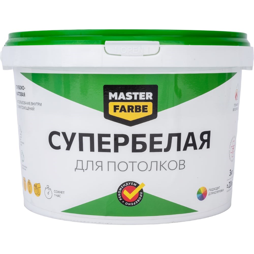 Водно-дисперсионная краска для потолков в сухих помещениях MASTERFARBE (супербелая; 3 кг) 4631159427477 используется для окраски потолочных поверхностей из бетона, гипсокартона, ДСП, ДВП в жилых и других сухих помещениях.Преимущества:Не желтеетЛегко наноситсяУкрывает за 2 слояСертифицирована для детских и лечебных учреждений RU.01.PA.02.015.E.000715.07.20Пожаробезопасна, класс пожарной опасности КМ1 сертификат RU C-RU.ПБ74.В.00257/21