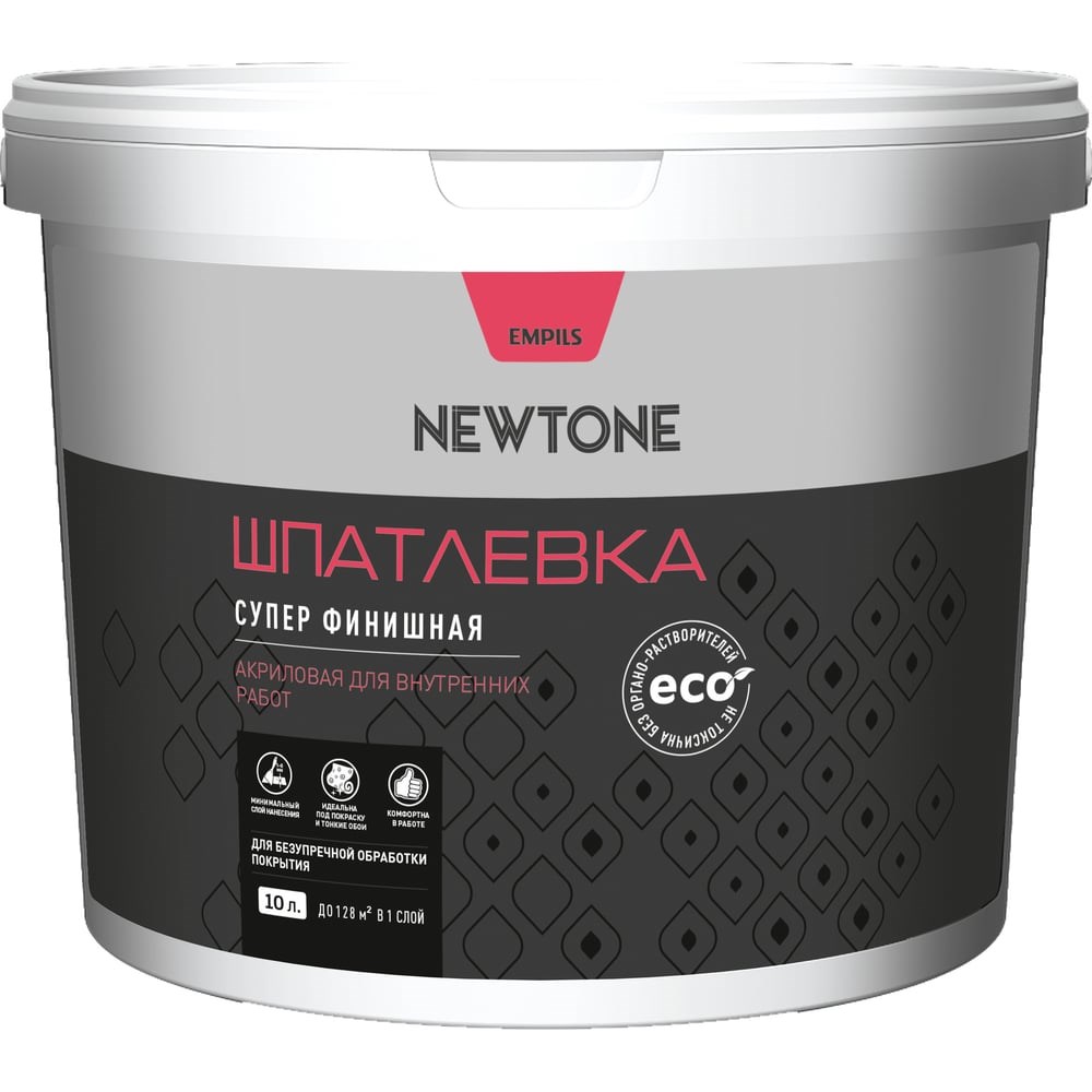 Шпатлевка Newtone ВД, супер финиш NEW, 10 л, 16.6 кг 81603 предназначена для финишного выравнивания различных поверхностей (кроме металлических) внутри помещений перед оклеиванием их обоями (в том числе шелкографией), окраской. Высококачественная тонкодисперсионная шпатлевка повышенной белизны. Готова к применению. Удобна в работе, обладает высокой пластичностью, позволяя вытягиваться "в ноль". Создает идеально ровные, без мельчайших дефектов поверхности. Легко шлифуется. Стойкая к растрескиванию, обеспечивает превосходное сцепление с поверхностью. Допускает колеровку в пастельные тона. В качестве колеровочного материала рекомендуется использовать краски-колер или универсальные пасты ОРЕОЛ.