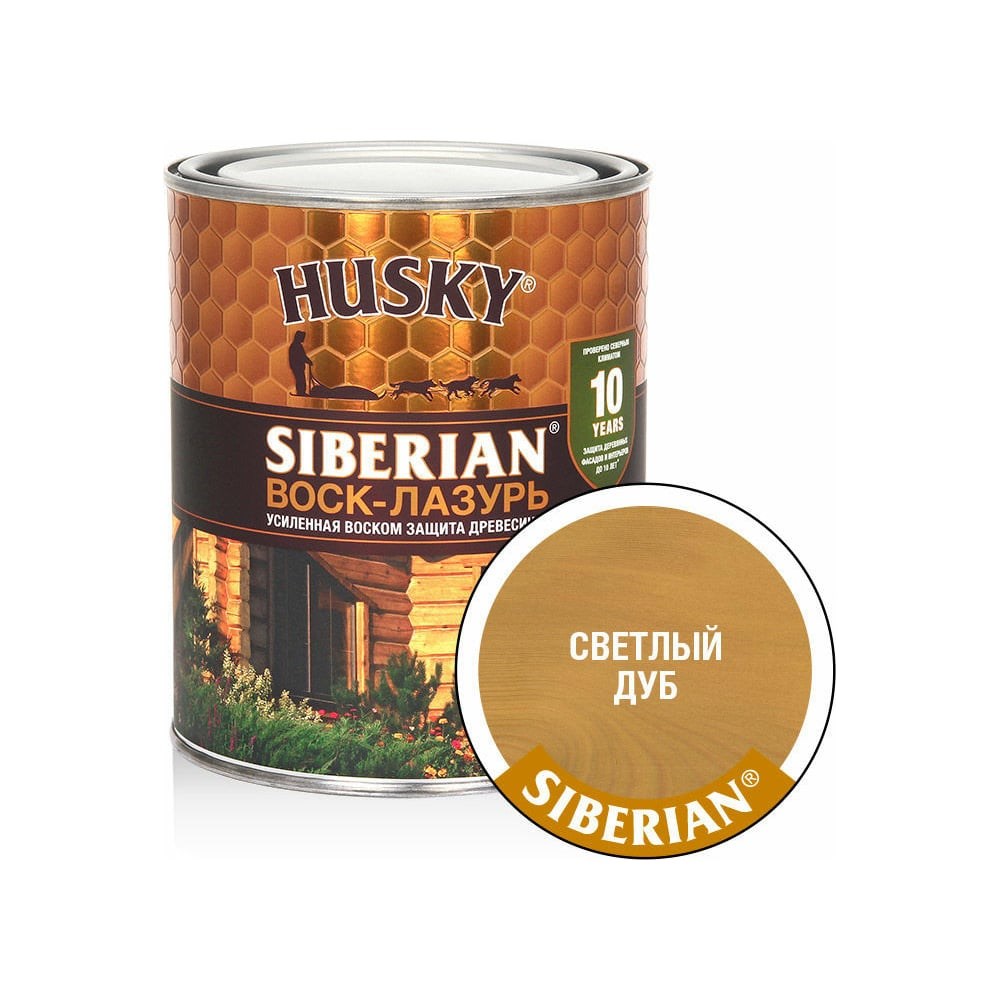 Воск-Лазурь HUSKY SIBERIAN светлый дуб 0,9 л 29985 - усиленный воском экологичный 100% акриловый антисептик для долговечной защиты древесины. Применяется для окраски деревянных фасадов, стен, конструкций, декоративных элементов снаружи и внутри помещений. HUSKY SIBERIAN ВОСК-ЛАЗУРЬ – мощная декоративная защита и здоровье деревянного дома. Усиленный воском состав обеспечивает защиту деревянных фасадов и интерьеров до 10 лет без повторной окраски. В отличие от большинства декоративных антисептиков для древесины, ВОСК-ЛАЗУРЬ не содержит органические растворители, практически не пахнет и сохраняет естественную экологию деревянного дома. Декоративно-защитный состав сохраняет видимой структуру древесины, наносится легко и равномерно, быстро высыхает и создает шелковистое полуматовое водоотталкивающее покрытие, устойчивое к УФ-излучению солнца. Современные биозащитные добавки защищают древесину от поражения грибком, плесенью и насекомыми.