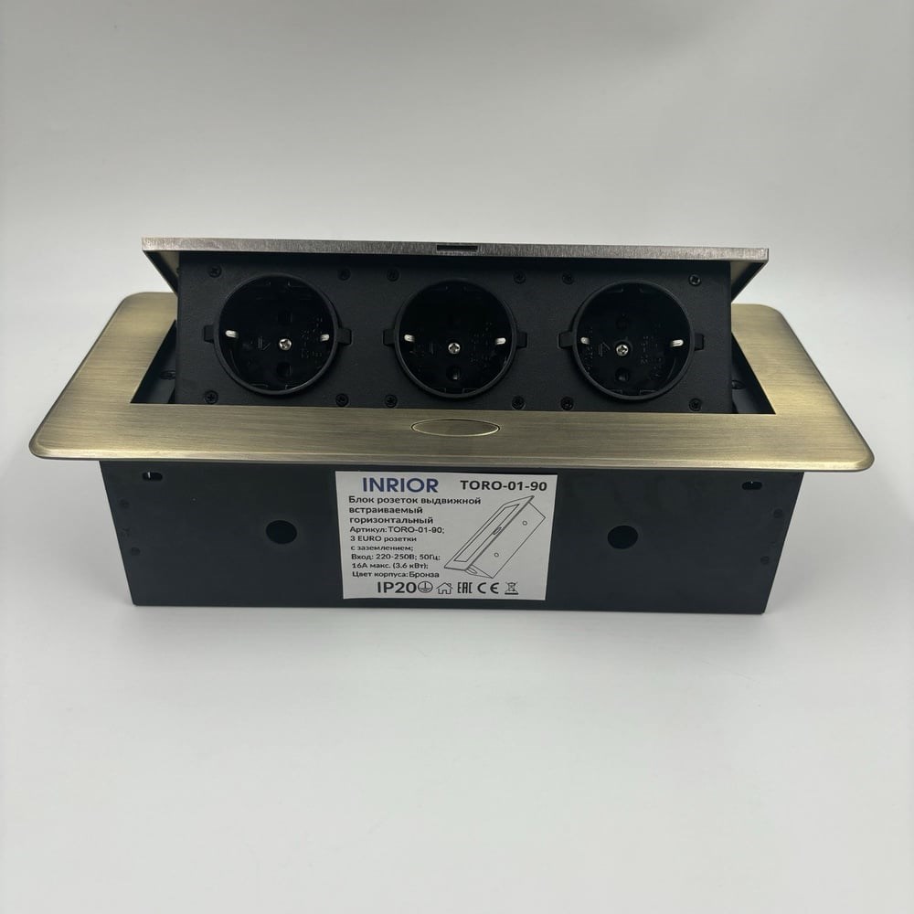 Выдвижной встраиваемый блок розеток, на 3 EURO розетки, TORO-01-90 используется для монтажа в столах и столешницах, на кухне и в офисе, в навесных шкафах и т.д. Блок розеток поставляется с металлической монтажной коробкой.Дополнительные характеристики:Материал: корпус, верхняя рамка, установочная коробка из металла.Врезное отверстие - 225х108 мм.Напряжение: 220-250 В.Максимальная мощность: 3600 Вт.Мощность позволяет подключать большинство бытовых приборов. Выдвижная розетка полностью из металла, лицевая панель выполнена из алюминиевого сплава, установочная коробка и сопутствующие элементы из стали. Это положительно сказывается на надежности и долговечности конструкции.