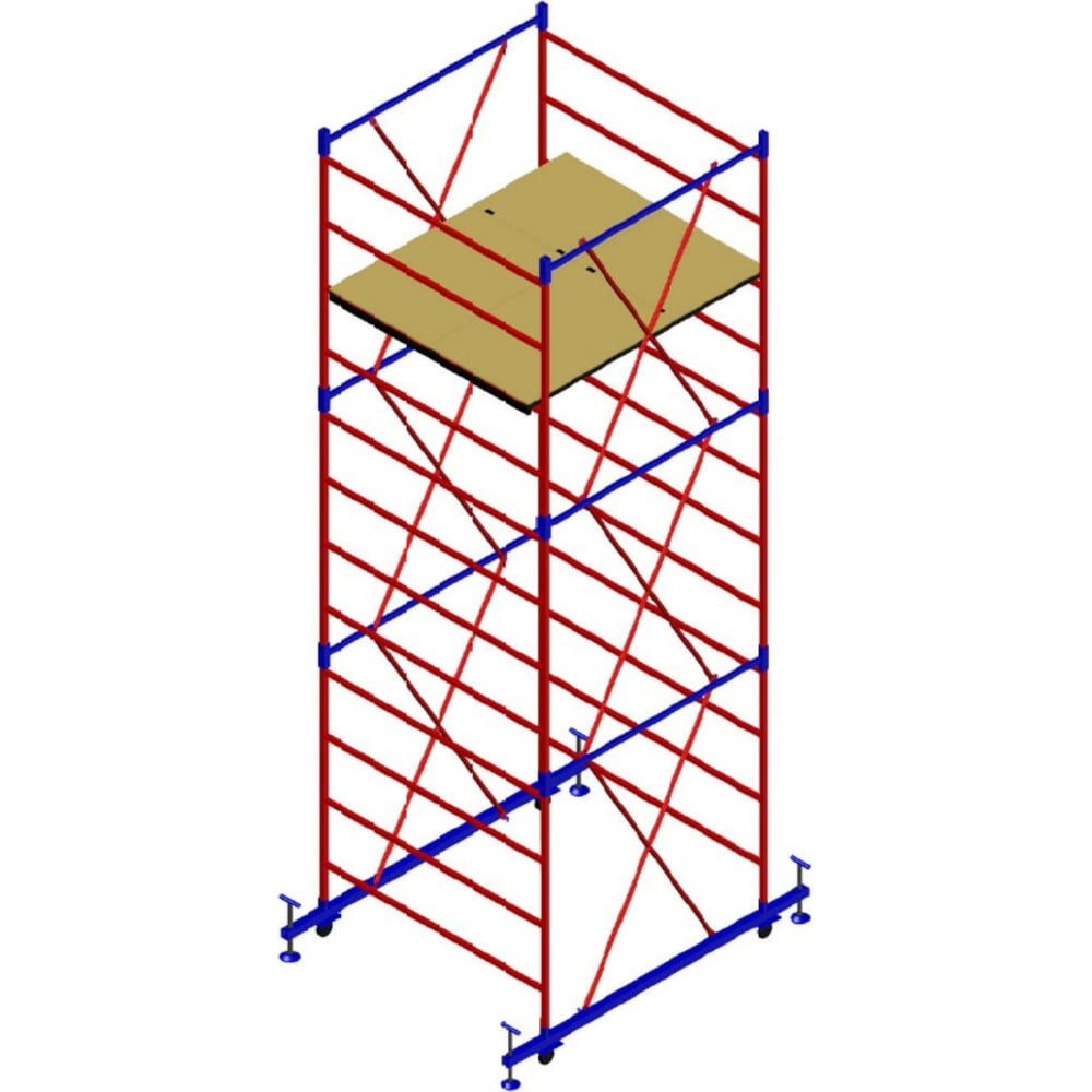 Вышка-тура Н=6,3м Мега 4М 935 укомплектована настилом. Модель состоит из прочных стальных труб, которые обеспечивают необходимую жесткость каркаса. Дополнительно использованы диагональные распорки, которые уменьшают вибрацию при эксплуатации модели. Простоту перемещения обеспечивает 4 колеса, которые расположены непосредственно под вертикальными опорами. Высота оптимальна для частных домов высотой в 1.5-2 этажа. Конструкция позволяет работать под самой крышей, выполняя отделочные работы любой сложности.